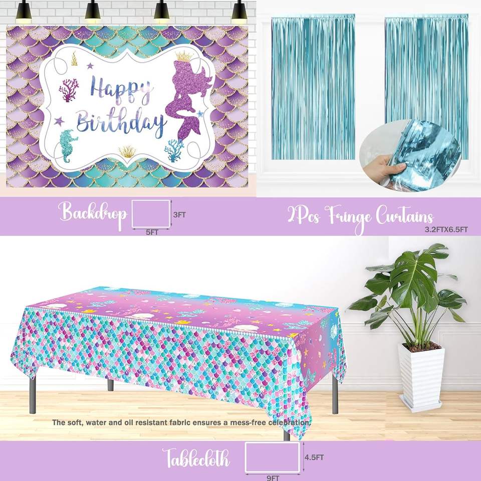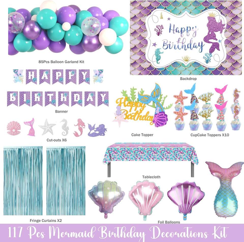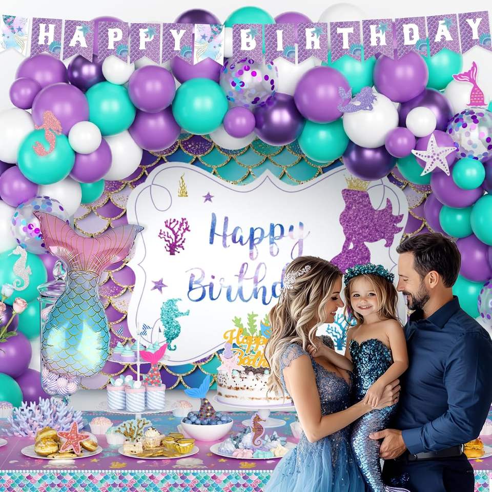 ชุดตกแต่งงานวันเกิดธีมนางเงือก ประกอบด้วยซุ้มลูกโป่ง สายรุ้งลูกโป่ง ฉากหลังสีฟ้าอมเขียว ป้ายลูกโป่งตัดลาย ผ้าปูโต๊ะ ที่ปักเค้กและคัพเค้ก