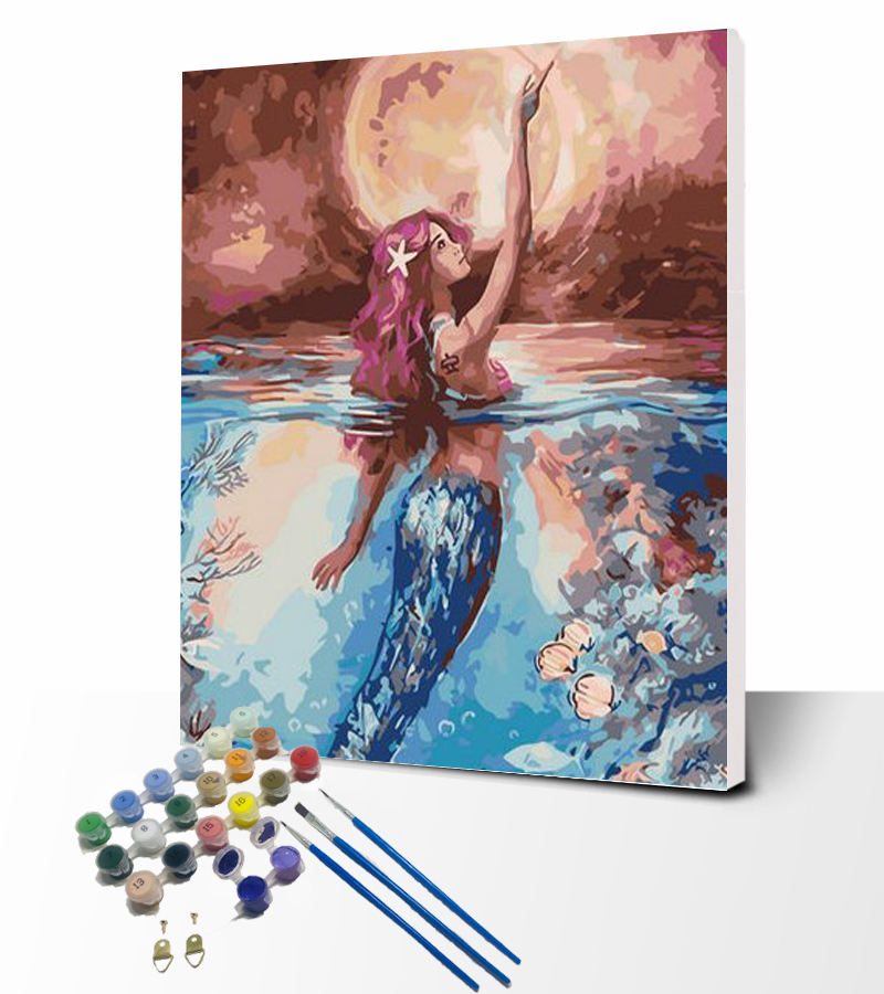 ภาพวาดนางเงือก DIY ระบายสีตามตัวเลข สีอะคริลิก ระบายสีตามตัวเลข ภาพวาดสีน้ำมันแบบวาดด้วยมือบนผ้าใบ สำหรับตกแต่งบ้าน ศิลปะติดผนัง