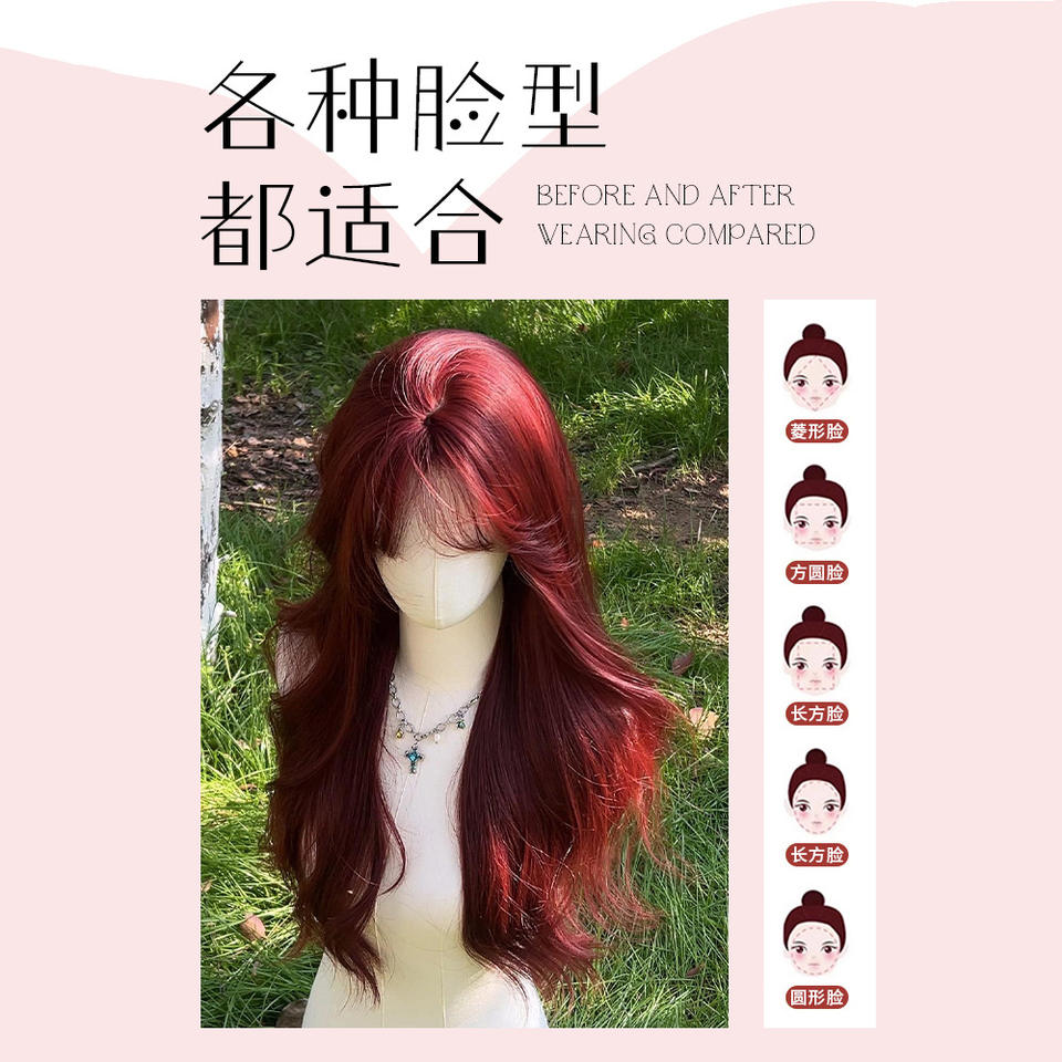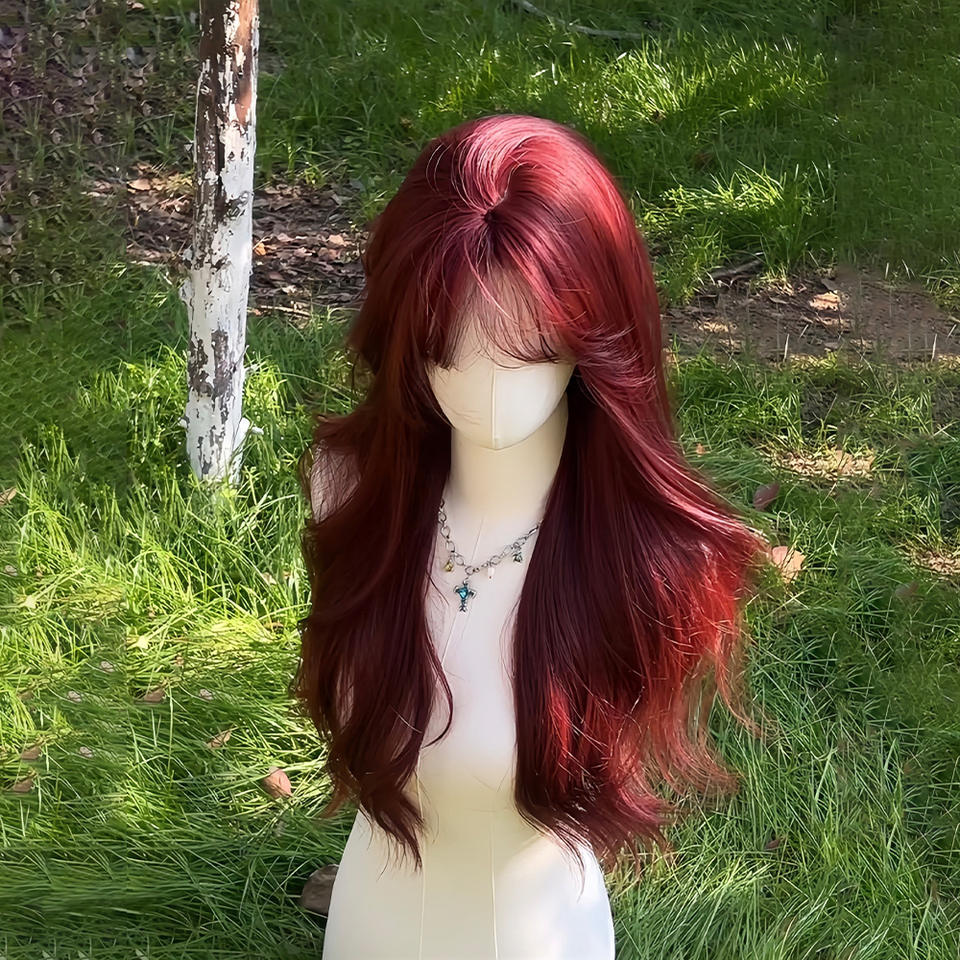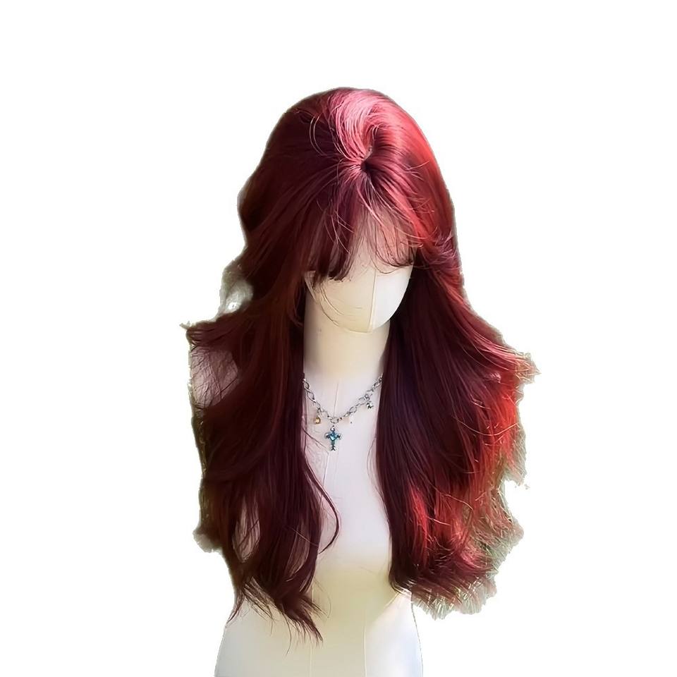 วิกผมยาวหยักศกสีแดงกุหลาบแบบเต็มศีรษะ พร้อมหน้าม้าปัดข้าง สำหรับผู้หญิง คอสเพลย์ แฟชั่น เสริมความงาม