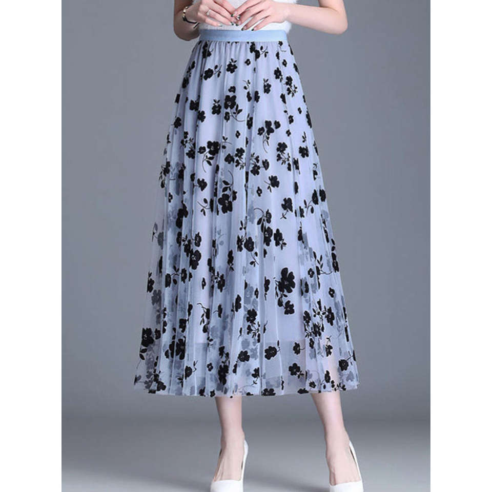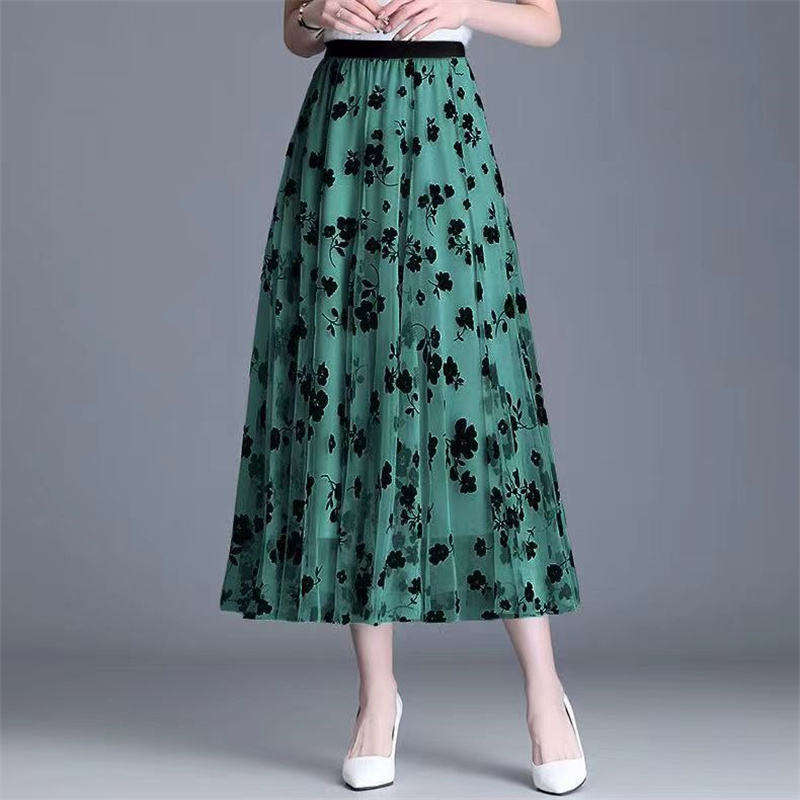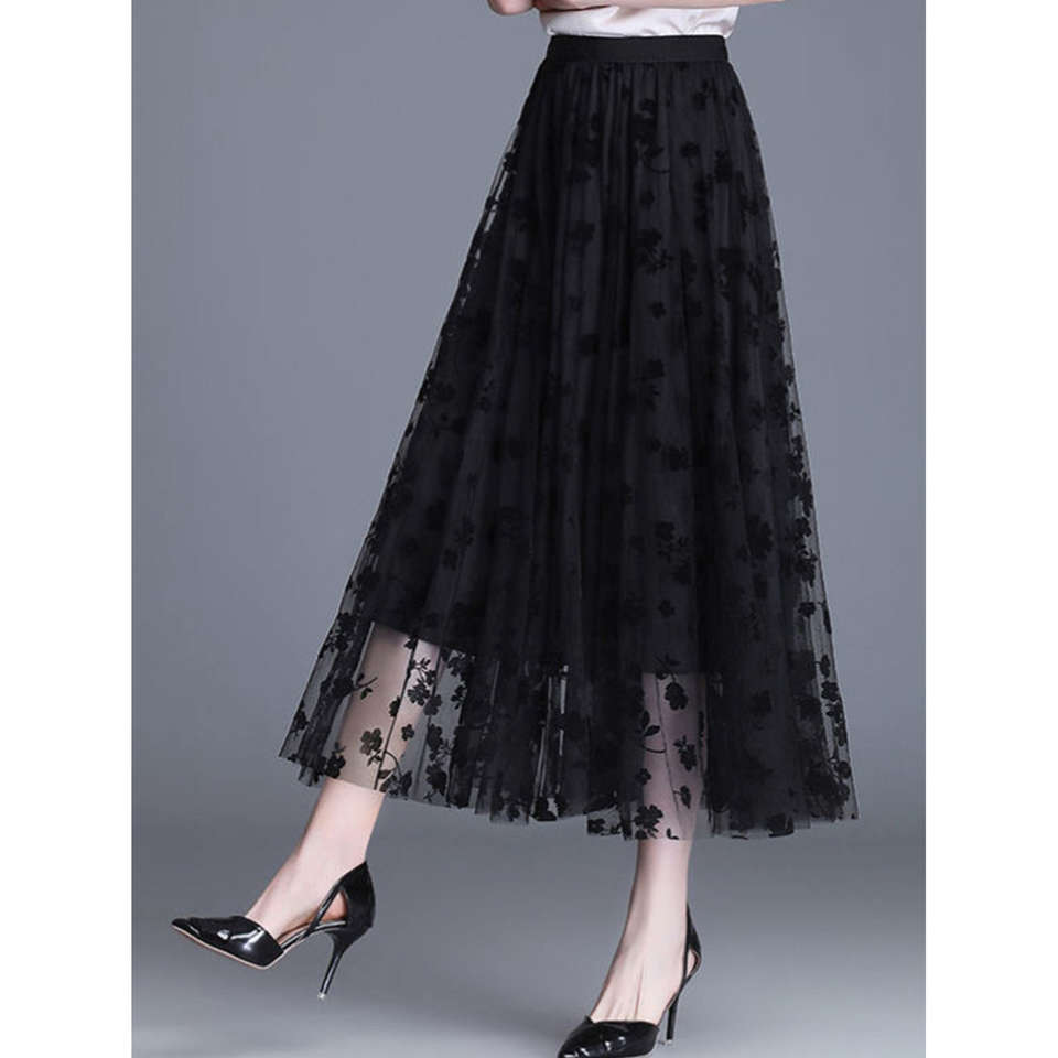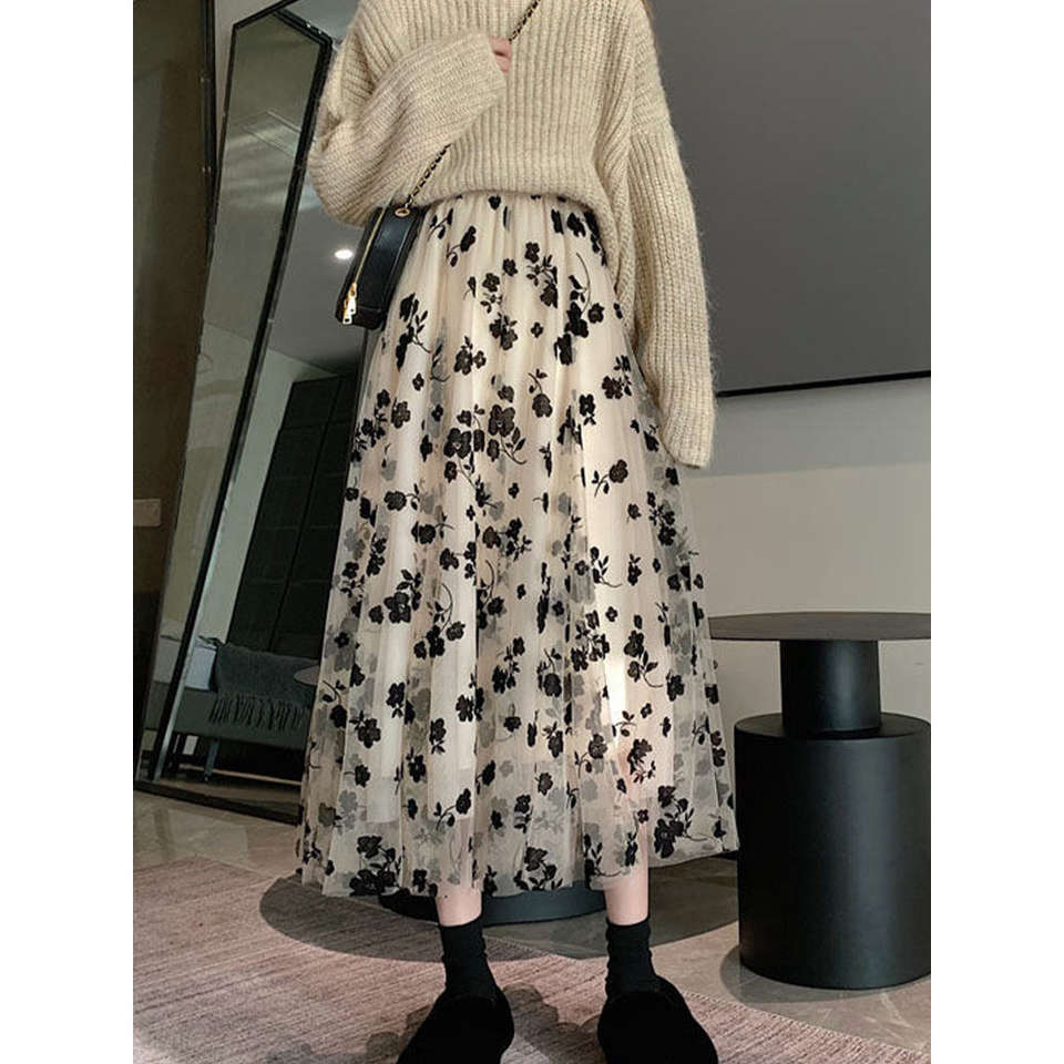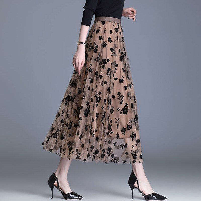 กระโปรงทรงเอไลน์ผ้าลูกไม้ลายดอกไม้ประดับด้วยผ้ากำมะหยี่ เอวสูง ยืดหยุ่นได้ เหมาะสำหรับงานปาร์ตี้ แฟชั่นฤดูใบไม้ร่วงและฤดูหนาว สไตล์หรูหราสำหรับผู้หญิง