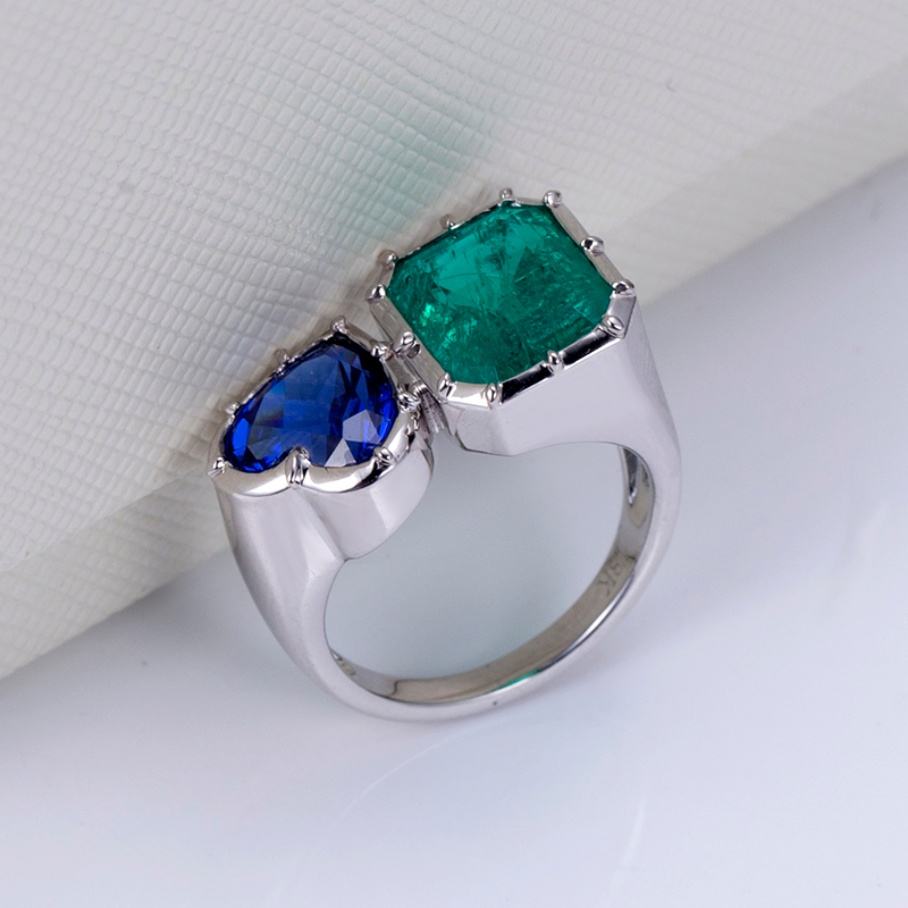 แหวนเพชรพลอยสั่งทำพิเศษ Messi Jewelry รุ่น MSR-1170 ทองคำขาว 18K ประดับพลอยแซฟไฟร์และมรกตสังเคราะห์