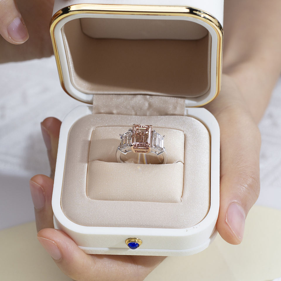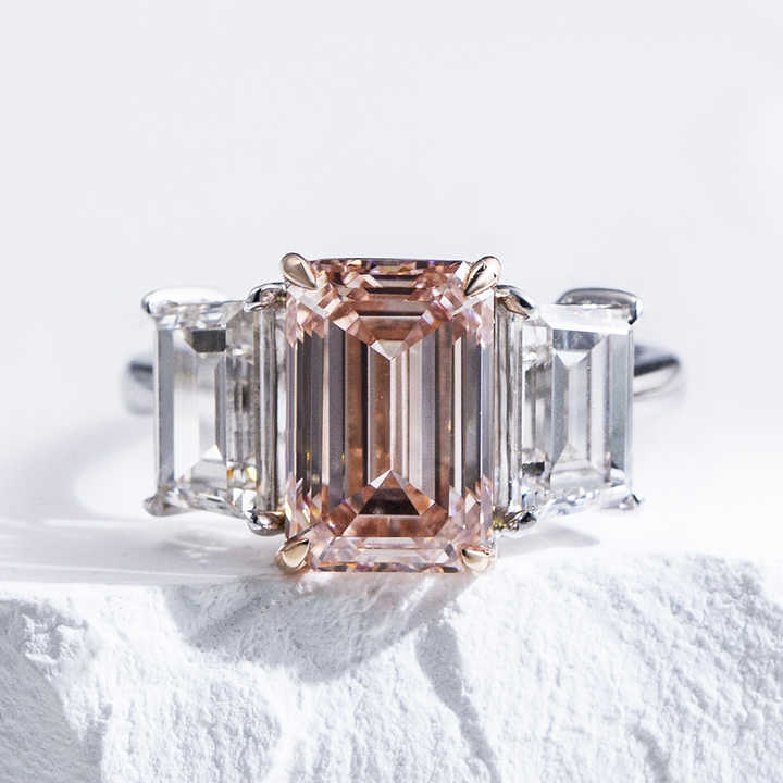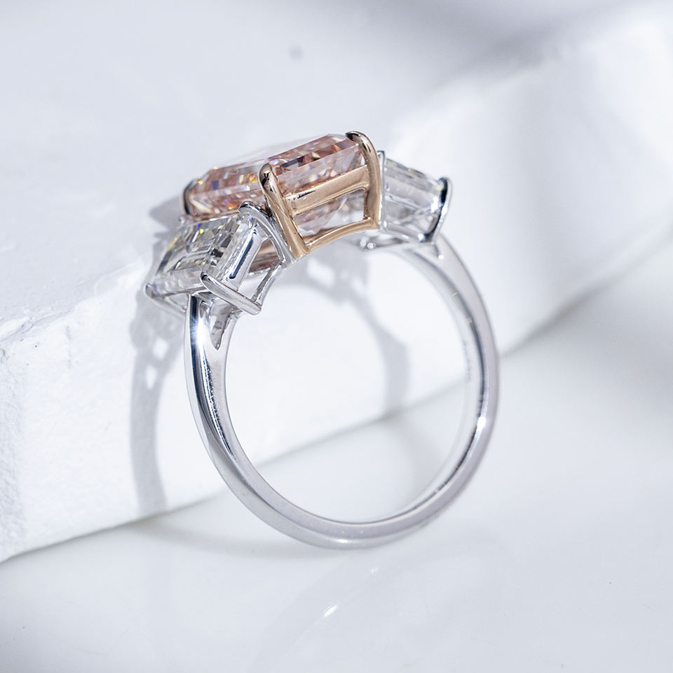 แหวนเพชรเม็ดใหญ่ทรงเหลี่ยมมรกตสามเม็ด ทอง 18K รุ่น MSR-1644 จาก Messi Jewelry ประดับเพชรชมพูเพาะเลี้ยงในห้องปฏิบัติการ เหมาะสำหรับเป็นแหวนหมั้น