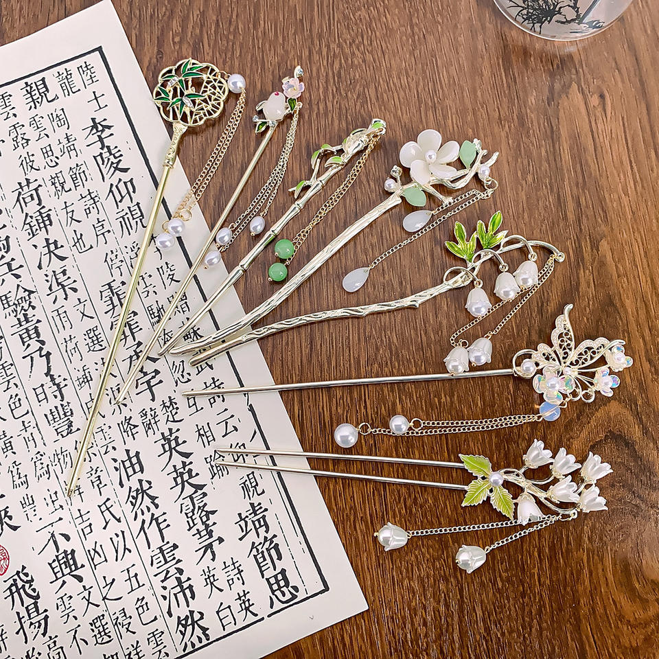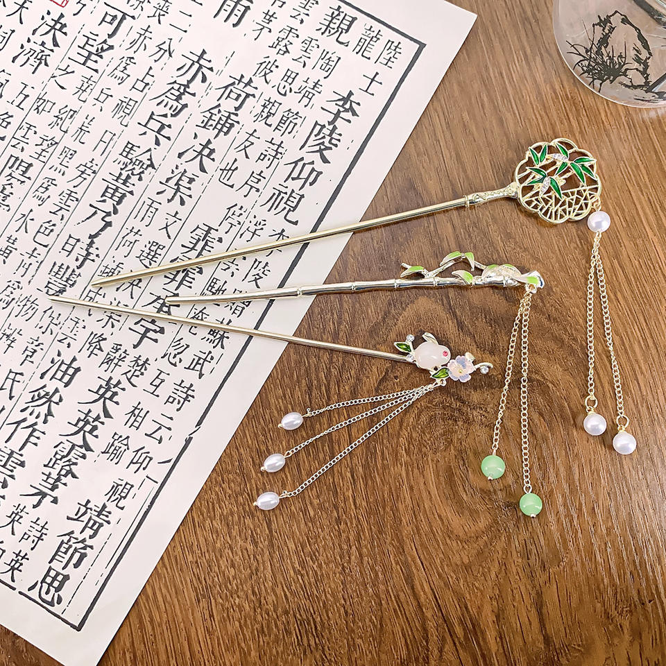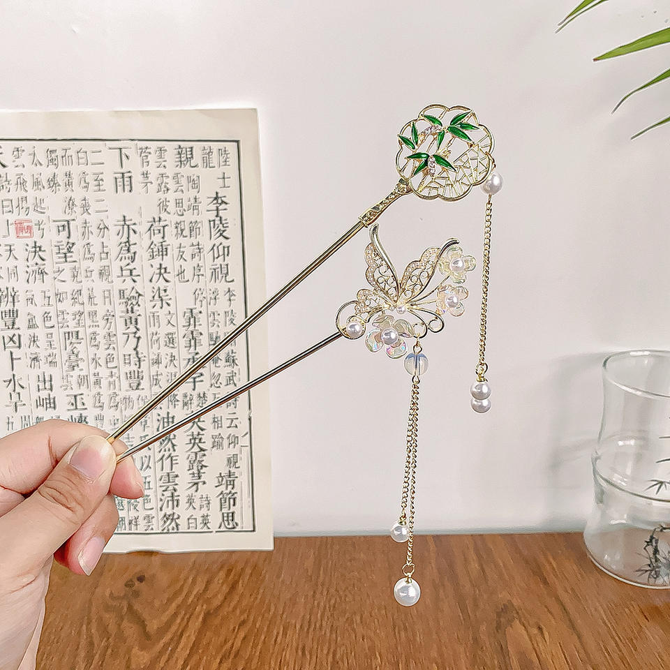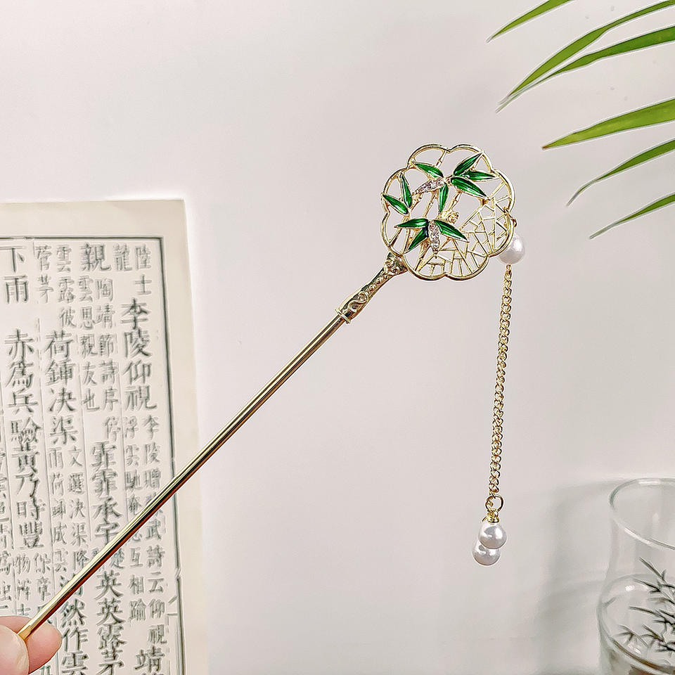 ปิ่นปักผมไม้ไผ่มีพู่ทรงพัดโบราณปิ่นปักผมสไตล์ย้อนยุคอุปกรณ์เสริมสำหรับผู้หญิง