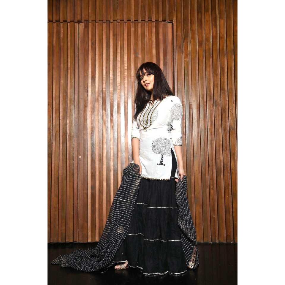 ชุดกระโปรงผ้าชีฟองสีดำและสีขาว ไซส์ XS เสื้อแขนสามส่วน