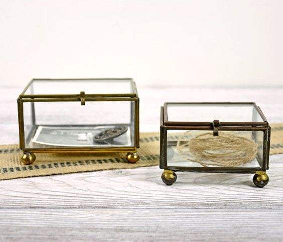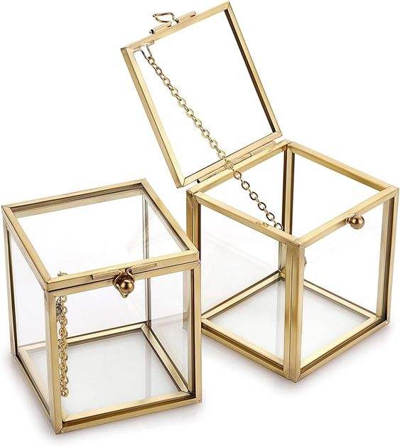 กล่องเครื่องประดับโลหะทองเหลืองและแก้วทรงสี่เหลี่ยมสีทองสำหรับตกแต่งโต๊ะในบ้านและเป็นของขวัญ