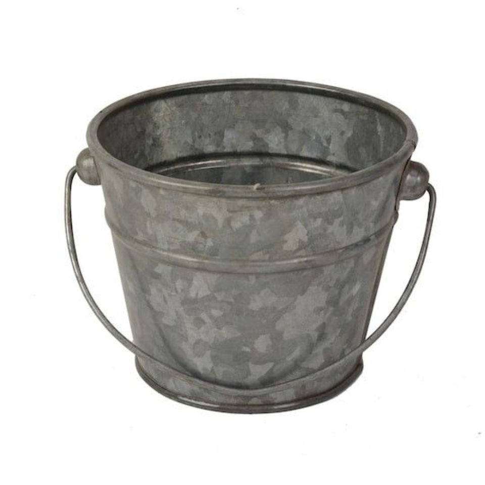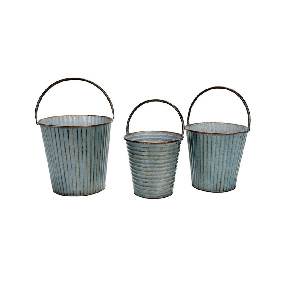 ชุดกระถางโลหะแบบถังเหล็กชุบสังกะสีพร้อมหูจับไม้ ลายคลื่นสีเทาขาวตกแต่งภายใน