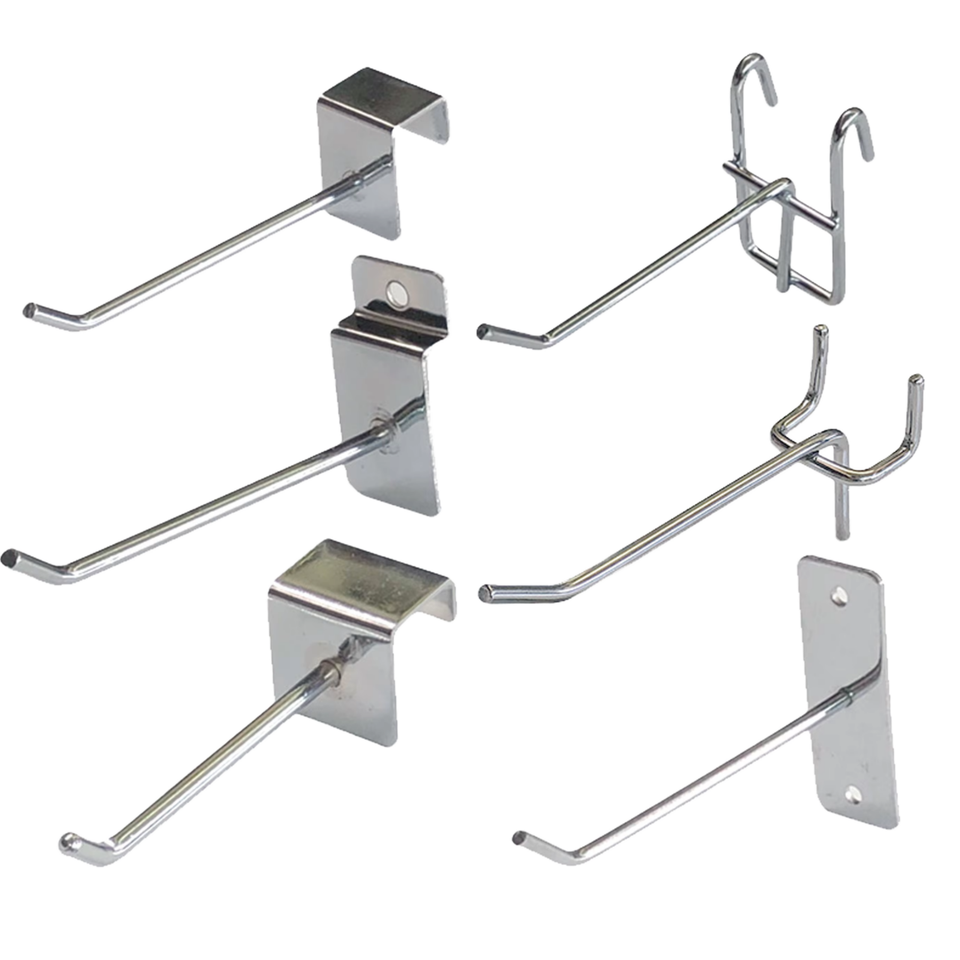 ตะขอแขวนผนังอุตสาหกรรมชุบโครเมียมสำหรับใช้กับแผ่นเพ็กบอร์ดในร้านค้าปลีก ความยาว 150 มม. เส้นผ่านศูนย์กลางลวด 6 มม.