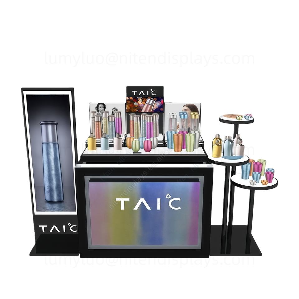 ชุดเคาน์เตอร์แสดงสินค้าแบบตั้งพื้นโลหะสำหรับเครื่องสำอางและผลิตภัณฑ์บำรุงผิว สำหรับห้างสรรพสินค้าและร้านค้าปลีก ตู้โชว์พรีเมียมแบบสั่งทำ