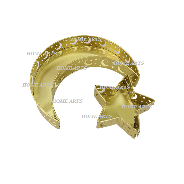 ถาดเสิร์ฟอาหารสีทองโลหะพร้อมถาดเสิร์ฟขนมรูปดวงจันทร์และดาว