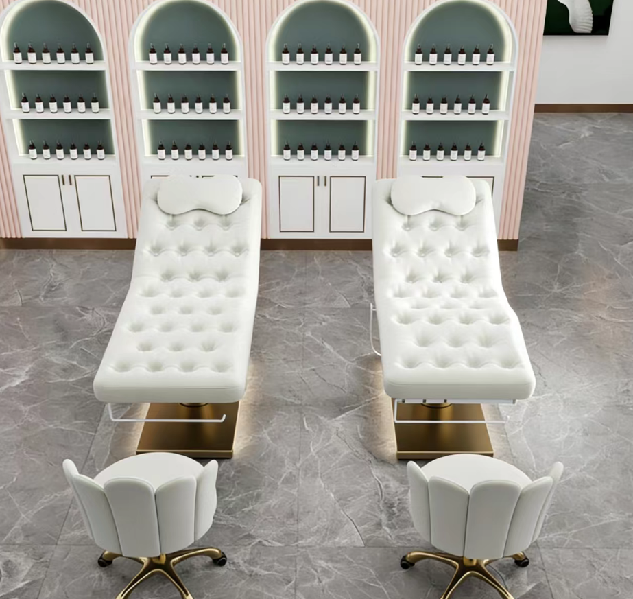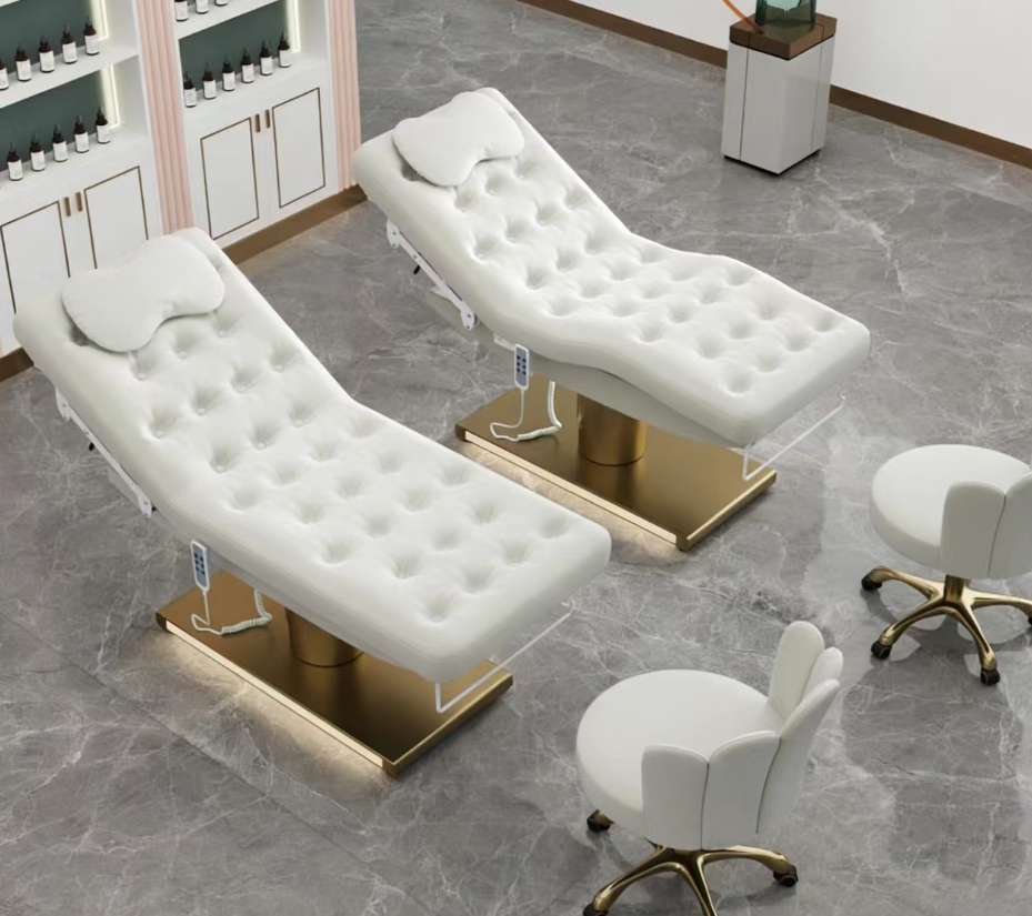เตียงนวดและเตียงทำทรีทเมนต์หน้าแบบสามมอเตอร์ ฐานสีทอง คุณภาพสูง หรูหรา