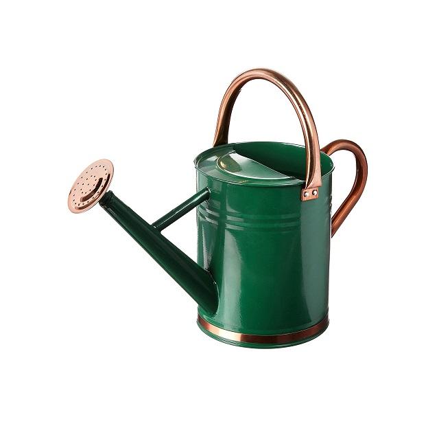 กระป๋องรดน้ำสวนเคลือบผงโลหะสีเขียวพร้อมฝักบัวสีน้ำตาลและที่จับเหยือกน้ำในสวน