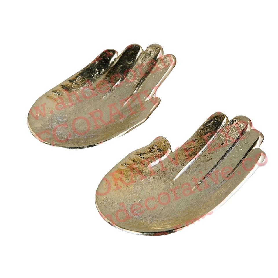 ถาดเสิร์ฟทองเหลืองโบราณในมือมนุษย์รูปร่างโรงแรมถาดสลัดโลหะโค้งมือสำหรับวางโต๊ะ