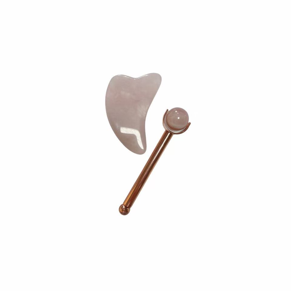 ลูกกลิ้งนวดหน้าและแผ่นกัวซาหยกโรสควอตซ์ ด้ามจับโลหะ สำหรับนวดหน้า