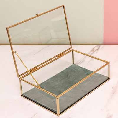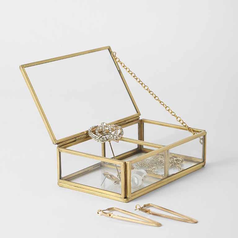 กล่องใส่เครื่องประดับทรงสี่เหลี่ยมทำจากแก้วใสทำจากโลหะกล่องเครื่องประดับสำเร็จรูปสีโรสโกลด์ต่างหูสำหรับใส่เครื่องประดับอเนกประสงค์
