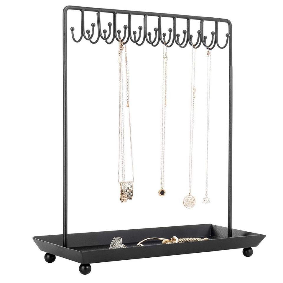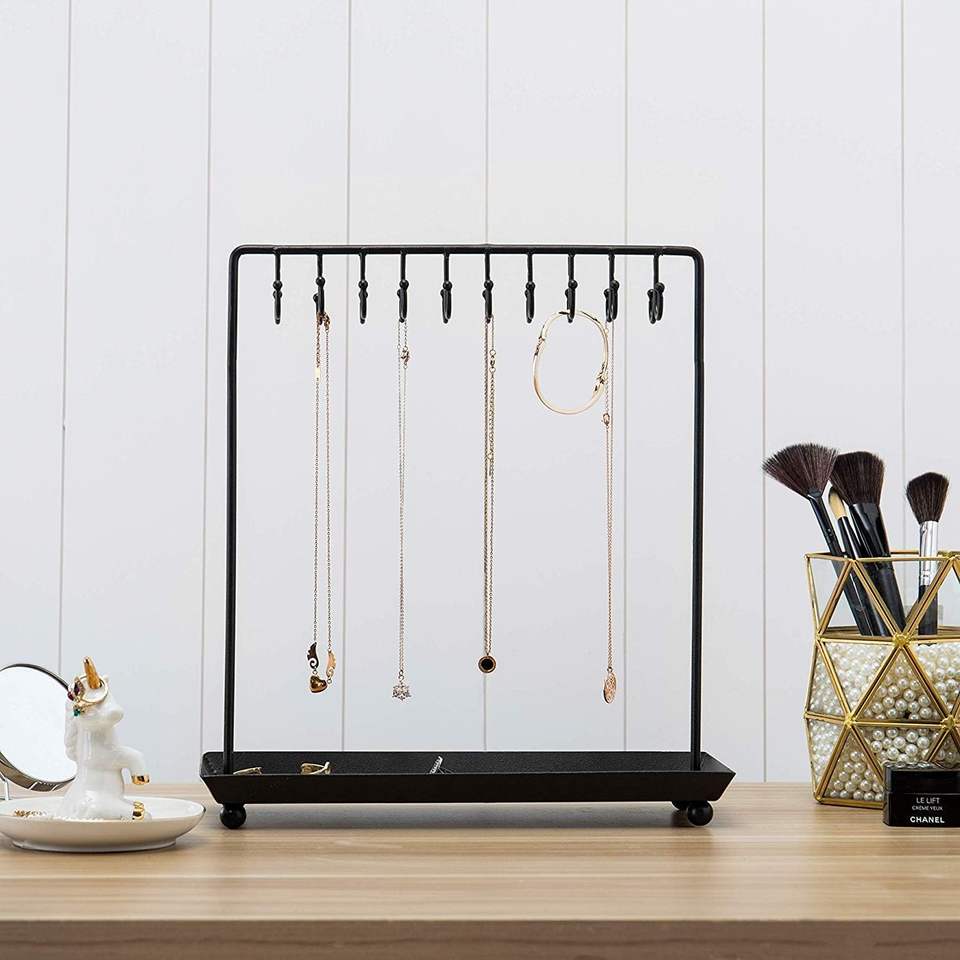 ที่วางเครื่องประดับโลหะพร้อมตะขอหลายอัน ถาดฐานสำหรับโชว์สร้อยคอ กำไล แหวน ใช้ในบ้าน ร้านค้า หรือวางบนเคาน์เตอร์
