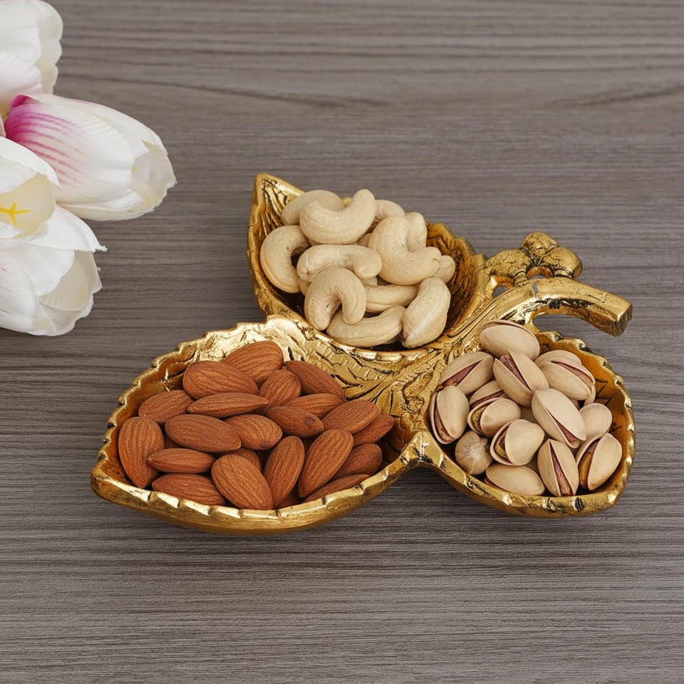 Metal Leaf Shape Dry Fruit Container Serving Tray Dry Fruit Box for Diwali Decorations Gold Serving Tray for Table Decor gift