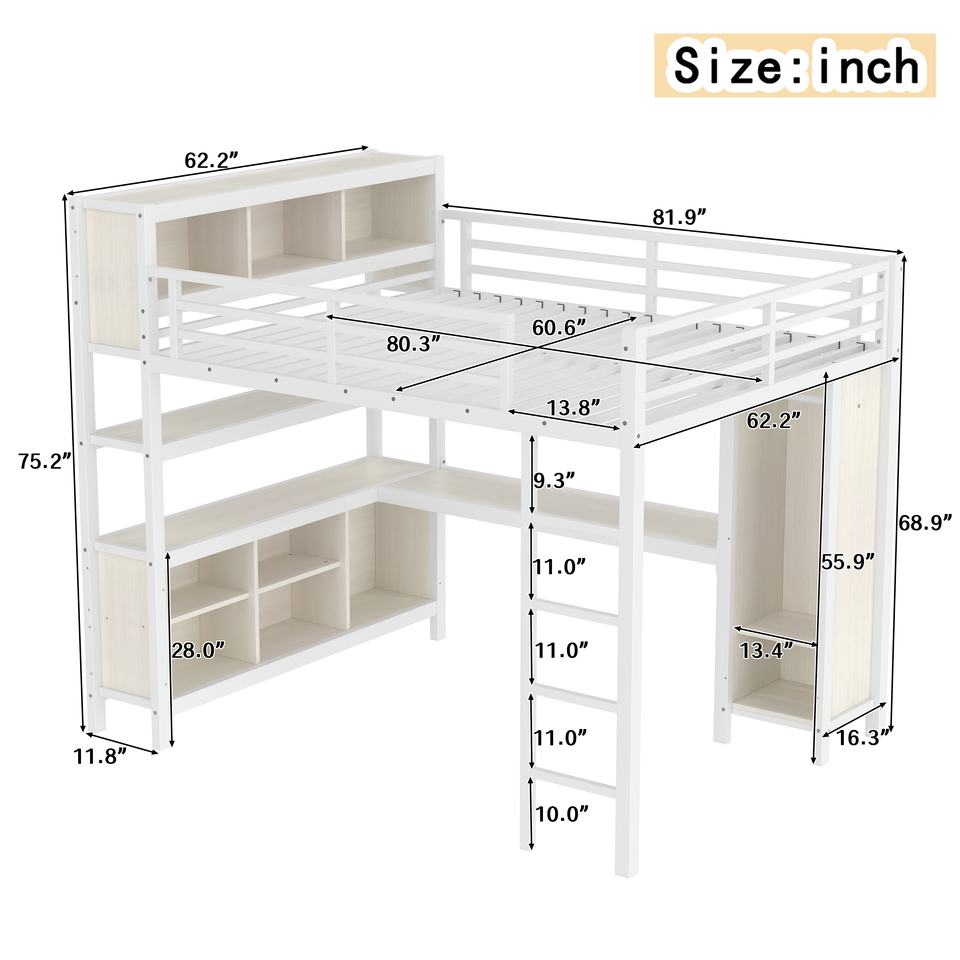 เตียงโลหะลอฟท์พร้อมตู้เสื้อผ้าเตียงลอฟท์ขนาดควีนไซส์พร้อมก้อนเก็บของและชั้นวางของทำจากไม้สีขาว