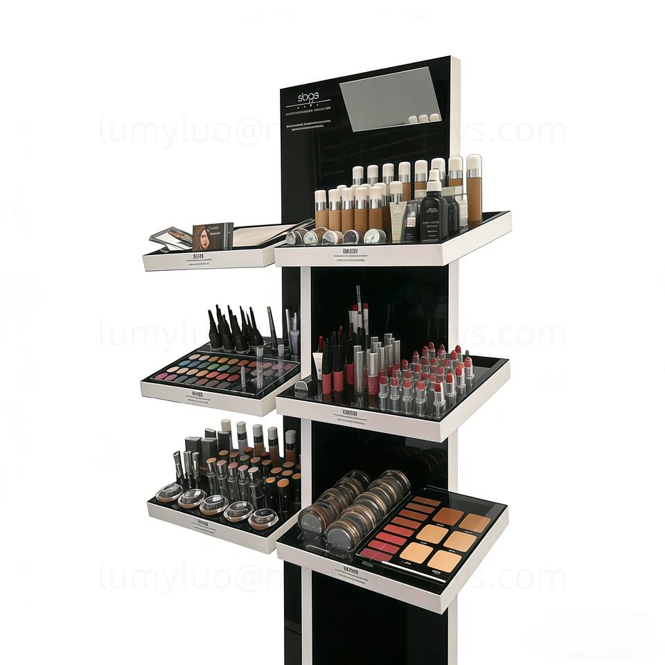 ชั้นวางเครื่องสำอางโลหะพร้อมกระจกและชั้นวางสำหรับวางบนเคาน์เตอร์ร้านค้าปลีก