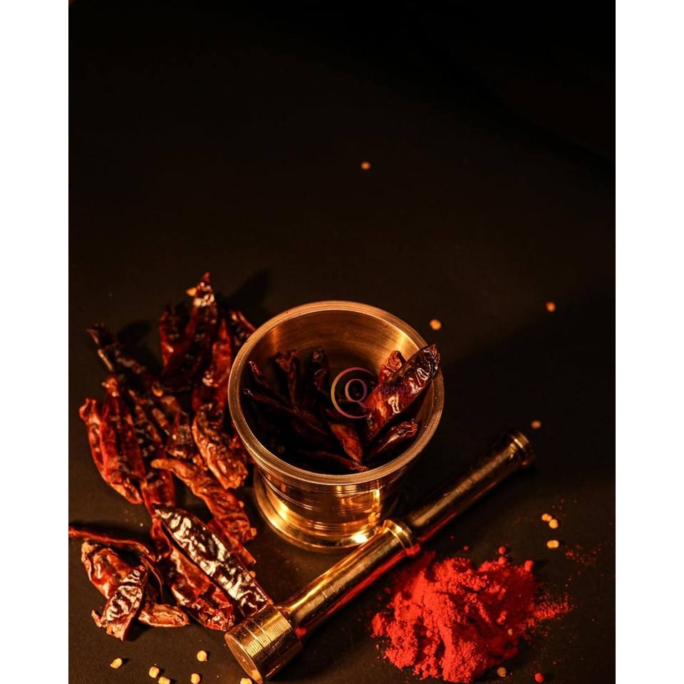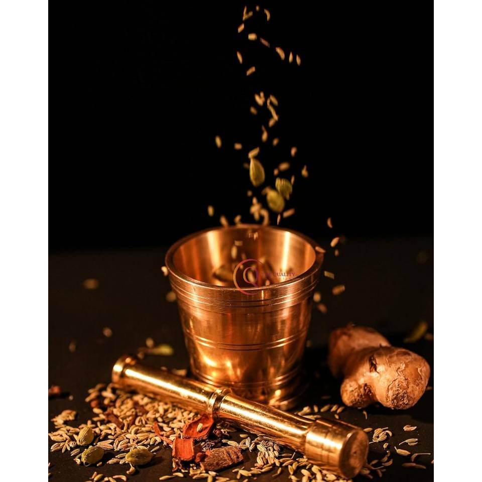 ครกโลหะและสากในทองเหลืองที่มีการตกแต่งแบบคลาสสิกเหมาะสำหรับอุปกรณ์บดและครัวแบบดั้งเดิมจากอินเดีย