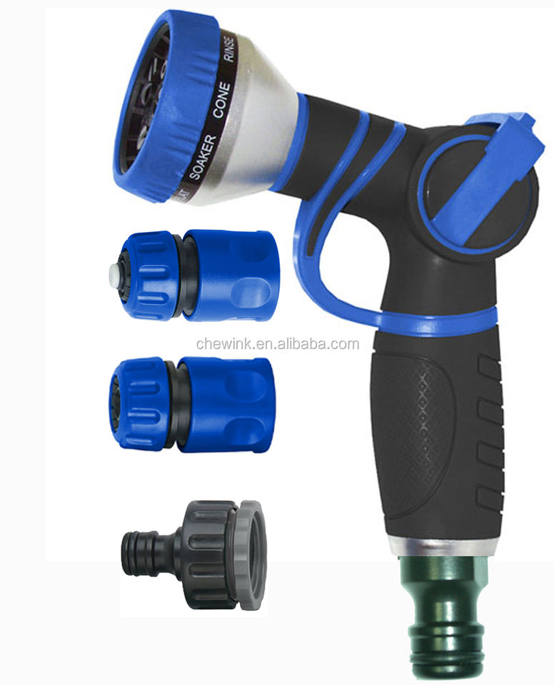 ชุดหัวฉีดน้ำรูปปืนแบบควบคุมด้วยนิ้วหัวแม่มือ ทำจากโลหะ/พลาสติก พร้อมหัวต่อ และรูปแบบการฉีดพ่นที่ปรับได้ สำหรับใช้รดน้ำในฤดูร้อน