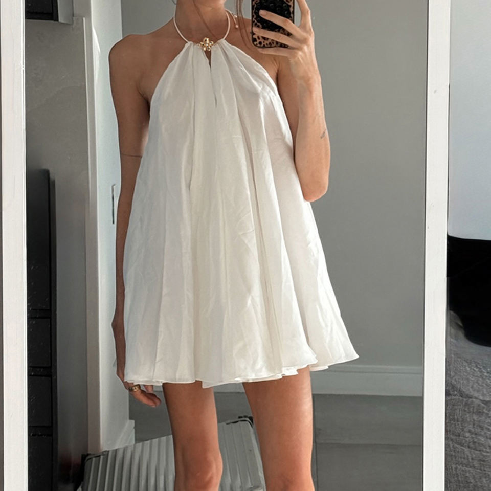 เดรสทรงเอลายดอกไม้ฝรั่งเศสประดับห่วงโลหะ ดีไซน์หรูหราทันสมัย เหมาะสำหรับวันหยุดพักผ่อนและงานปาร์ตี้