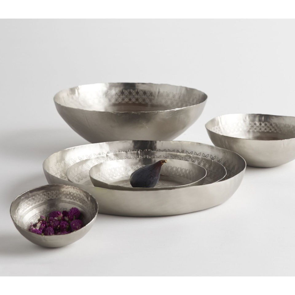 โลหะเงินถาดเสิร์ฟอาหารทรงกลมสําหรับร้านอาหารบ้านบนโต๊ะอาหารถาดเสิร์ฟสําหรับบ้านและอุปกรณ์ครัว