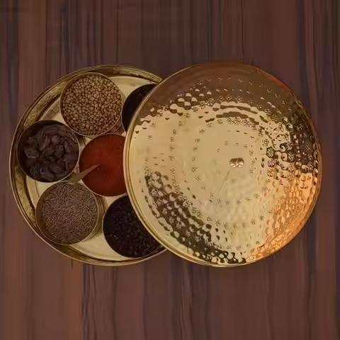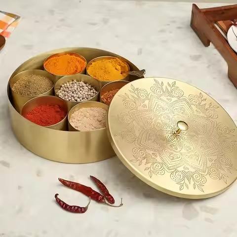 กล่องใส่เครื่องเทศโลหะ กล่องมาซาลา กล่องเก็บของในครัวหลายช่องพร้อมฝาปิด สำหรับใส่สมุนไพร เครื่องปรุงรส และใช้ในการทำอาหารอินเดีย