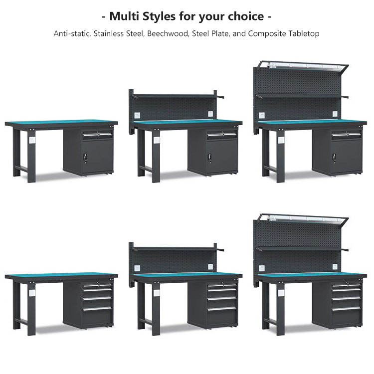 โต๊ะทำงานเหล็กสำหรับงานซ่อมบำรุง อุตสาหกรรม พร้อมตู้เก็บของแบบลิ้นชักสำหรับงานหนัก และโต๊ะไม้