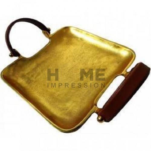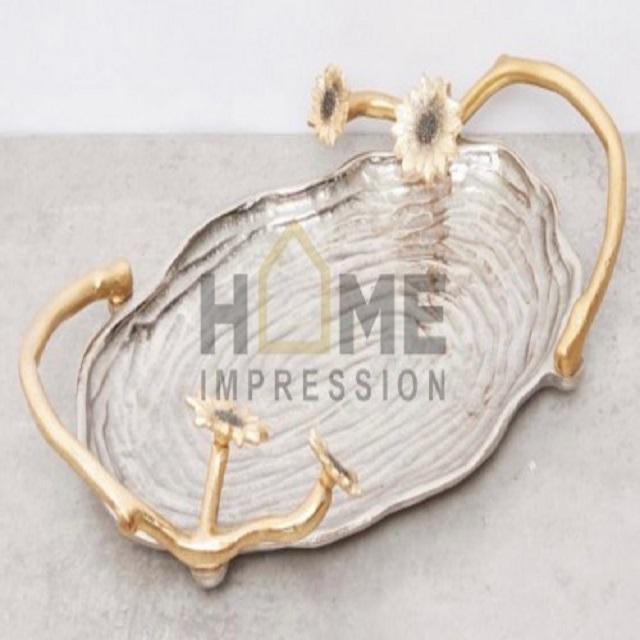 ถาดวางกลางโต๊ะพร้อมที่จับดีไซน์ใบไม้เคลือบสีขาวและเคลือบทองทำจากโลหะถาดตกแต่ง