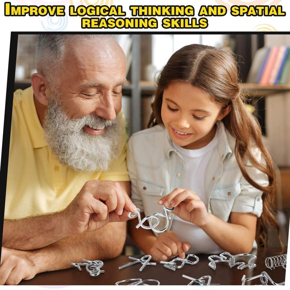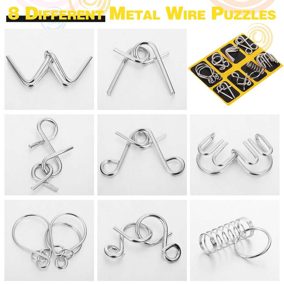 ชุดปริศนาลวดโลหะ 8 ชิ้น พร้อมกระเป๋า, เกมฝึกสมอง ทดสอบไอคิว ลวดเหล็กเชื่อมต่อ ปลดล็อค เกมฝึกสมองสำหรับงานปาร์ตี้ ของขวัญสำหรับเด็กและผู้ใหญ่