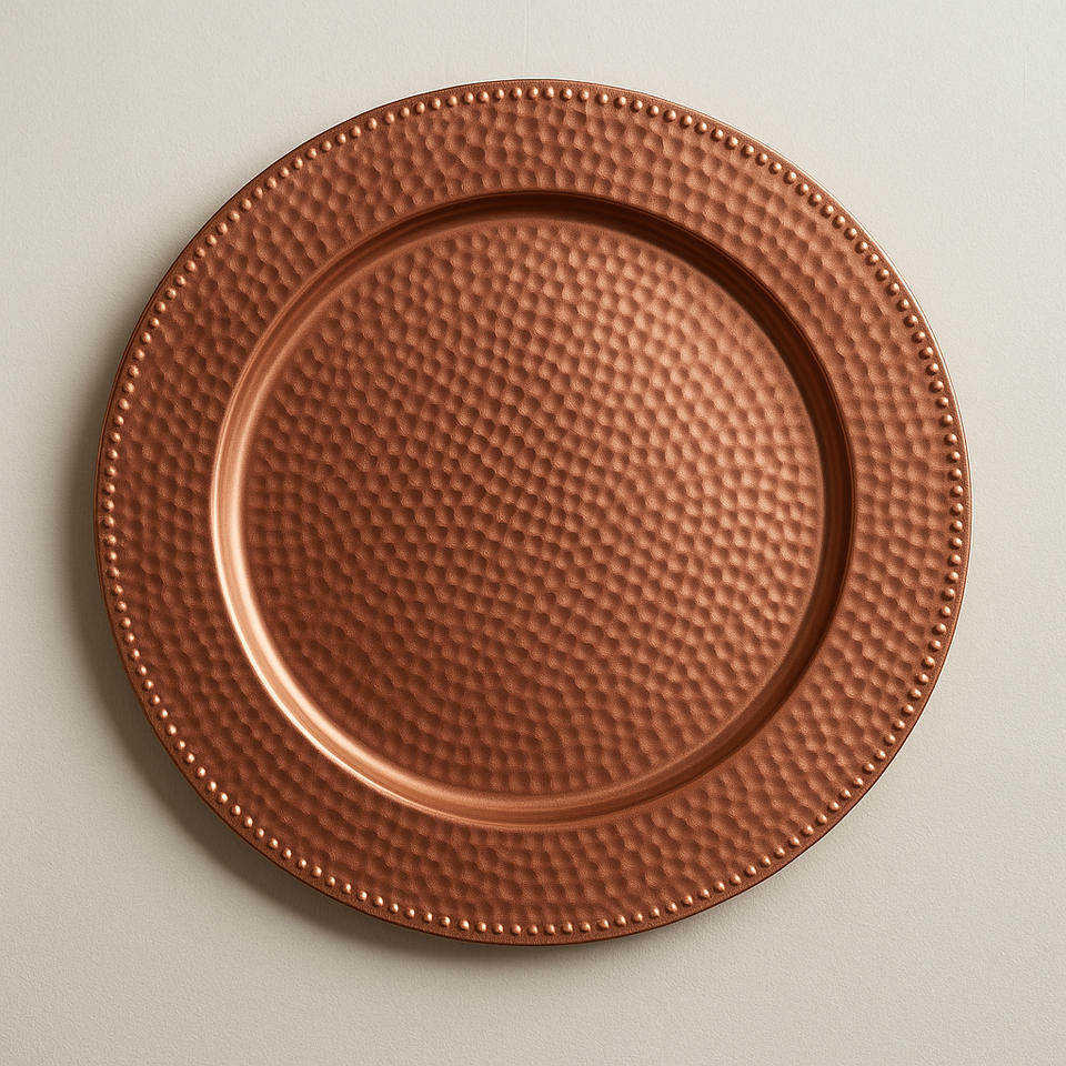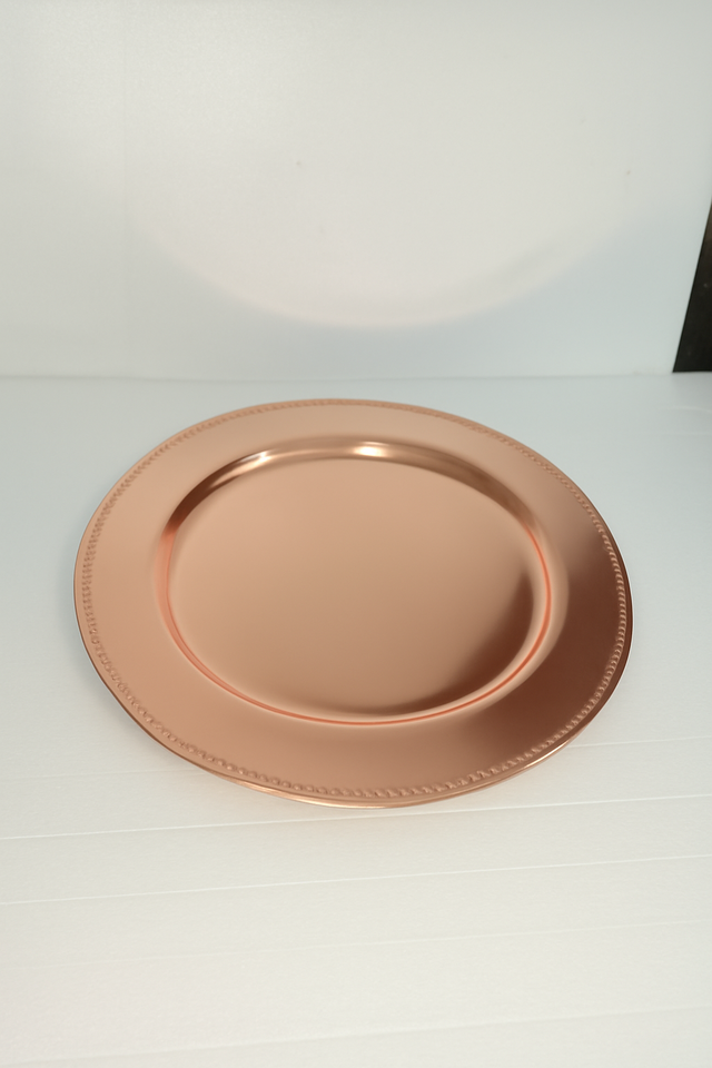จานรองอาหารโลหะสีโรสโกลด์โบราณแบบขายส่ง ขนาด 13 นิ้ว จานรองอาหารตกแต่งสำหรับโรงแรมและงานอีเว้นท์