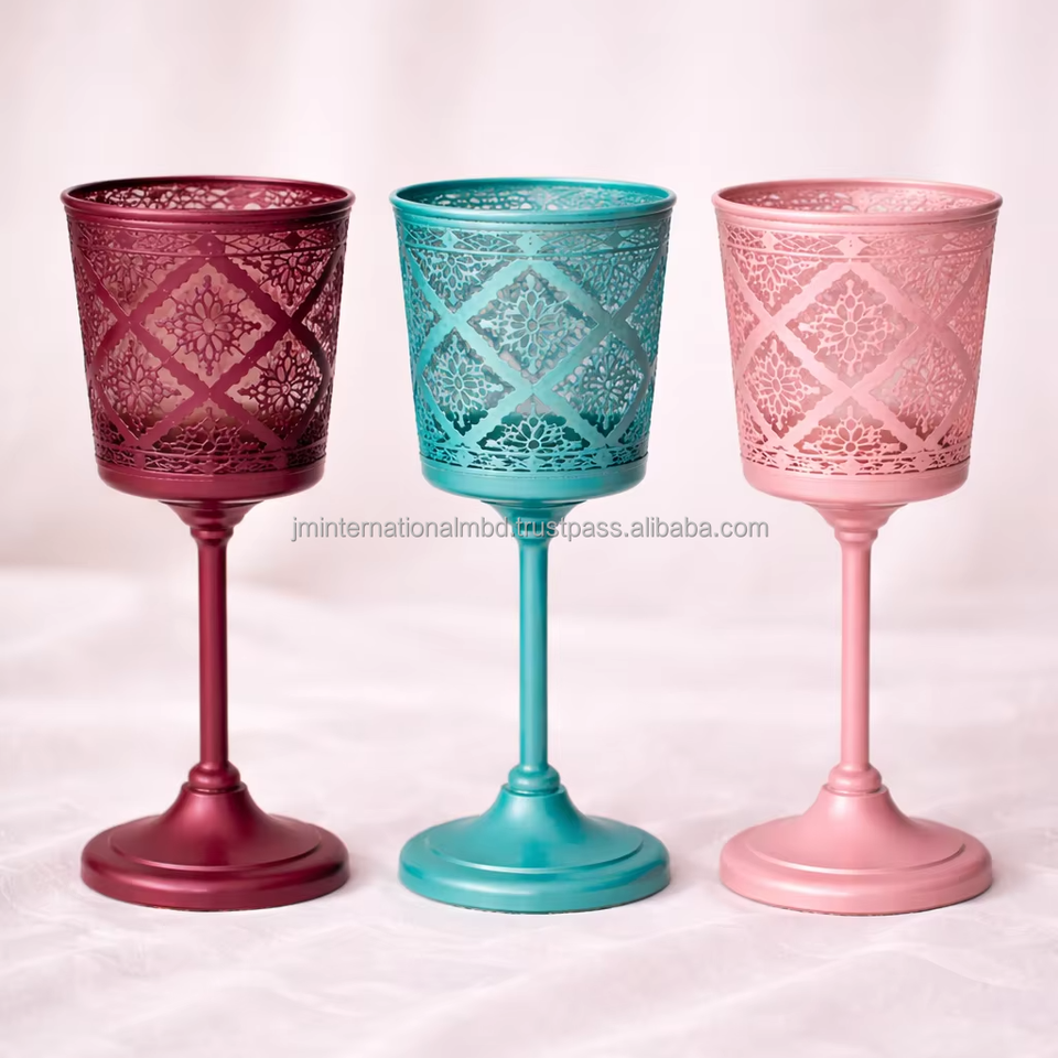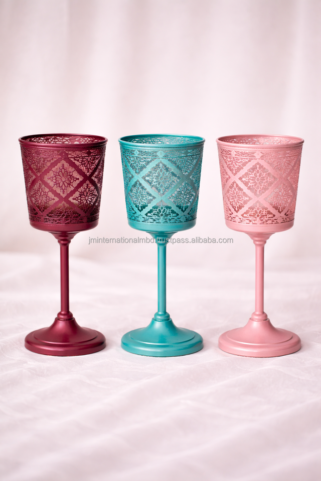 เชิงเทียนโลหะสลักลายพร้อมขาตั้งยาว – ชุด 3 ชิ้น (สีแดงเลือดหมู สีชมพู และสีเขียวอมฟ้า)