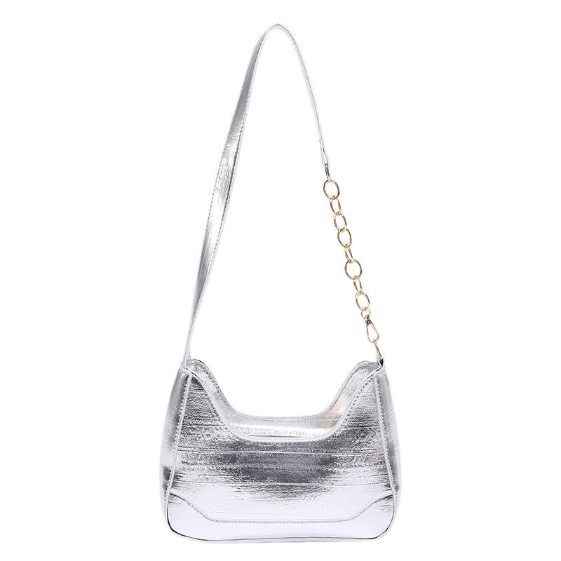 กระเป๋าใต้วงแขนโลหะมันวาวพร้อมของตกแต่งโซ่ทันสมัยและสะดุดตา