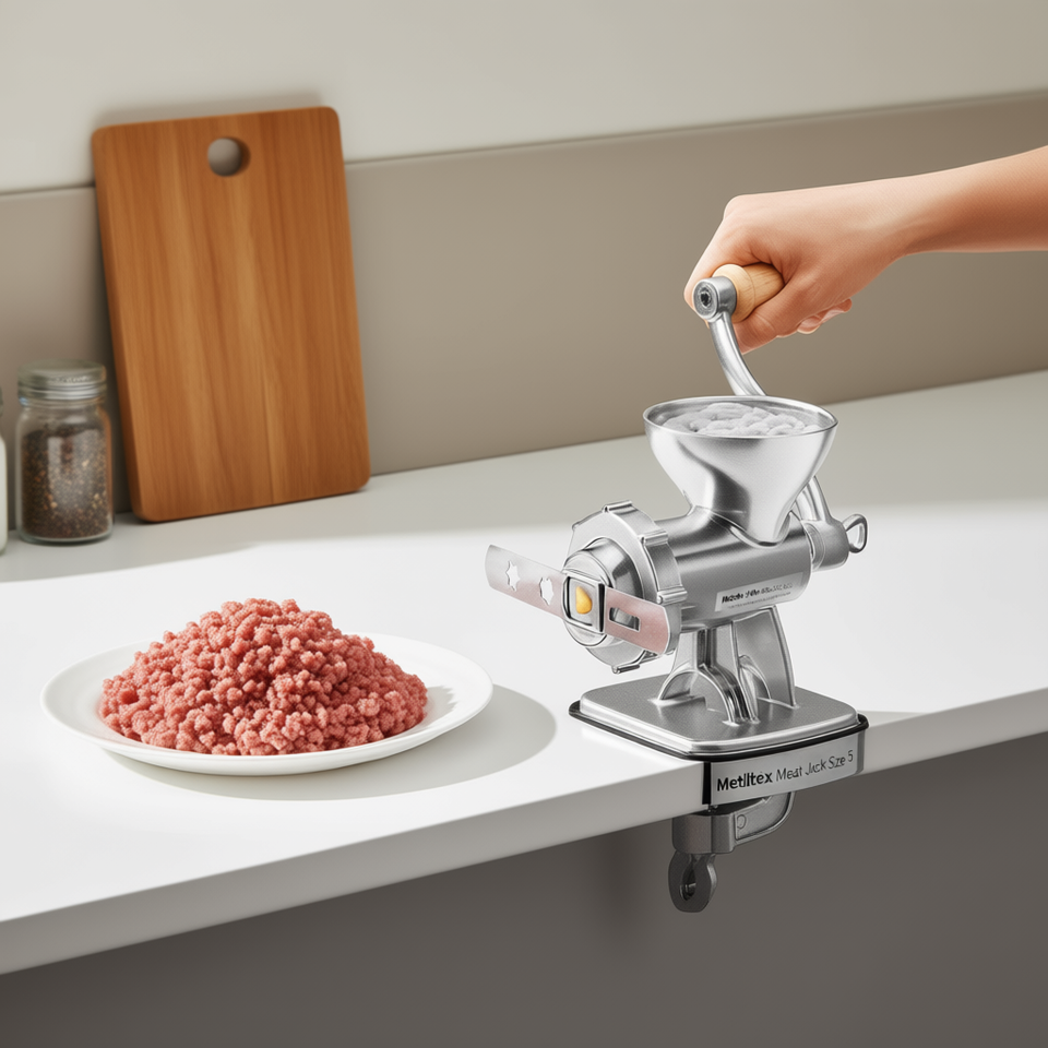 เครื่องบดเนื้อเมทัลเท็กซ์ รุ่นแจ็ค ไซส์ 5 พร้อมมือหมุนไม้และอุปกรณ์เสริม สำหรับใช้ในบ้าน