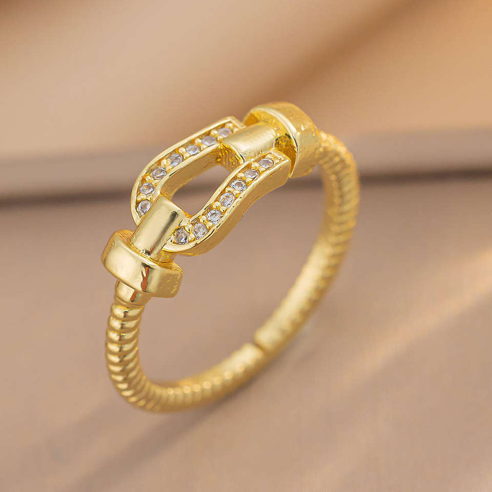 แหวนทองแดงเคลือบด้านทรงมินิมอลรุ่นเมโทรโพลิแทน ดีไซน์หัวเข็มขัดรูปเกือกม้า ลวดลายเส้นด้ายสีทอง แบบกำไลข้อมือ สวยหรู ทันสมัย