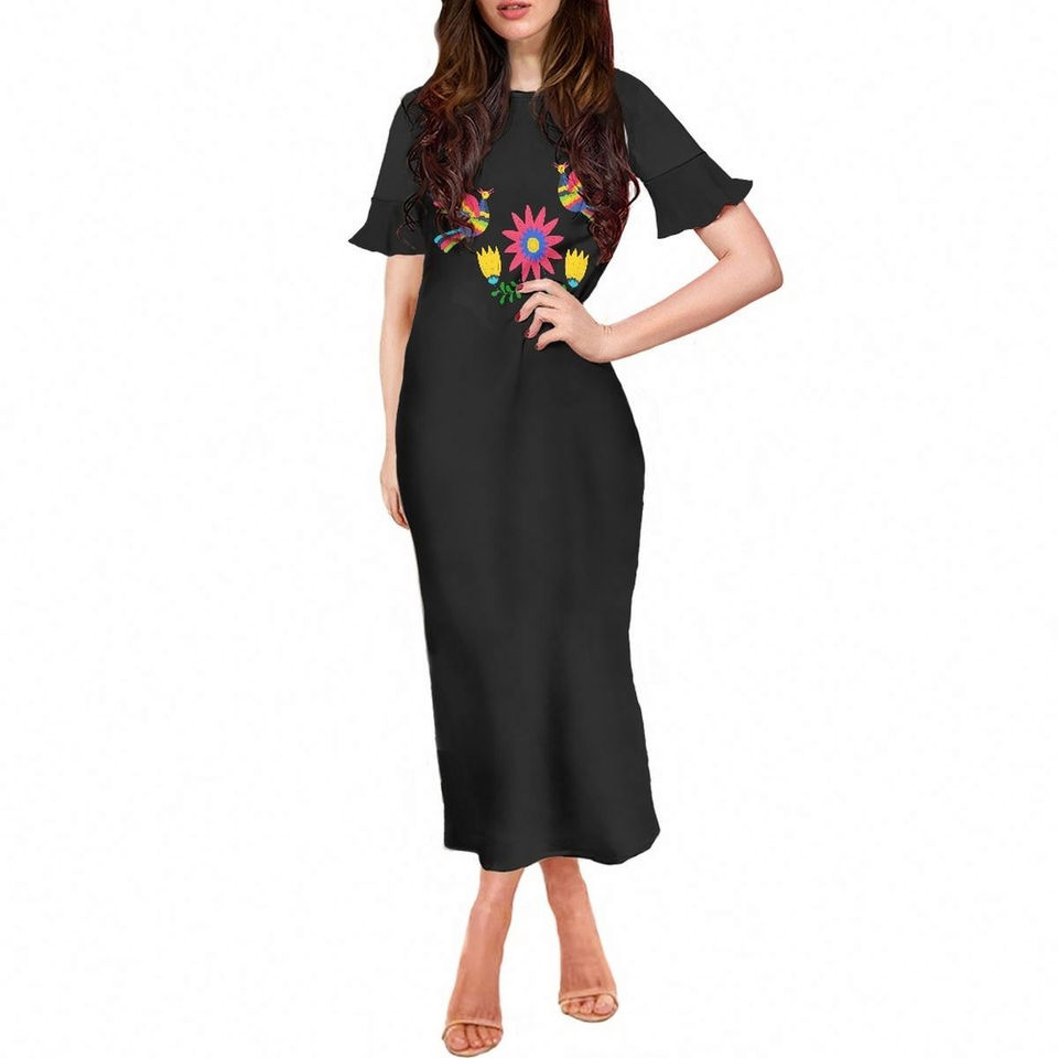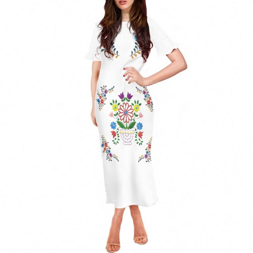 ชุดเดรสทรงเข้ารูปแขนกลีบดอกไม้ลายปักสไตล์เม็กซิกัน ไซส์พลัส ผ้าโพลีเอสเตอร์ แฟชั่นฤดูร้อน
