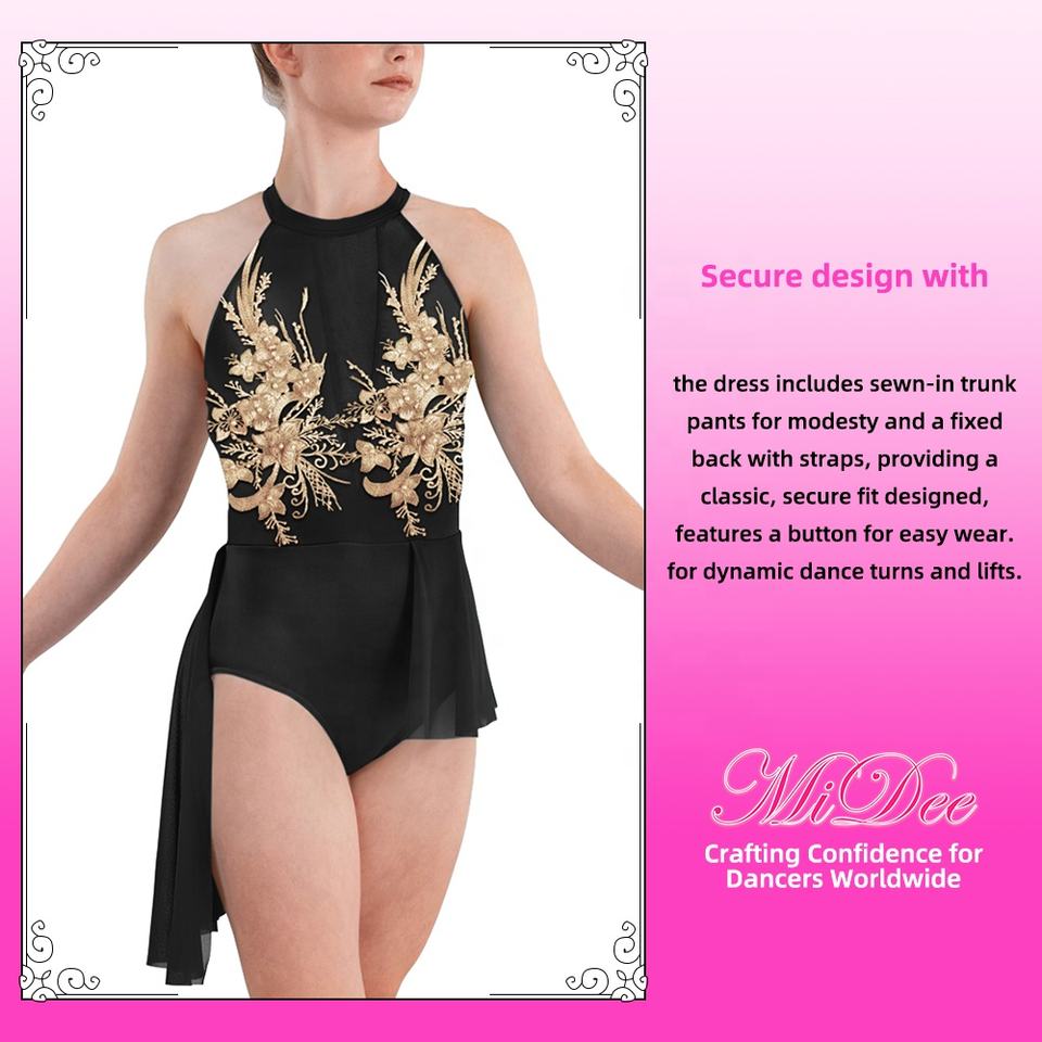 ชุดเต้นรำลีริคอลสำหรับผู้หญิง MiDee พร้อมกางเกงทรงขาบาน แต่งลูกไม้ปักลายดอกไม้ กระโปรงทรงไฮโลว์แบบอสมมาตร และสายรัดหลังหลายเส้น