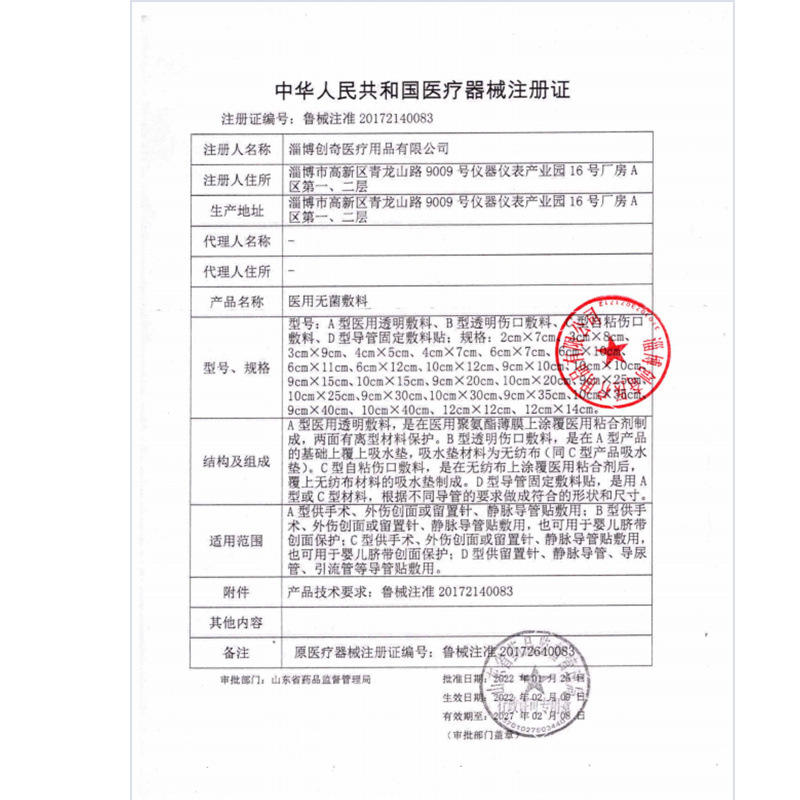 เลขที่อนุมัติยา (เครื่องมือแพทย์):ใบรับรองการจดทะเบียนเครื่องมือแพทย์มณฑลซานตง 20172140083