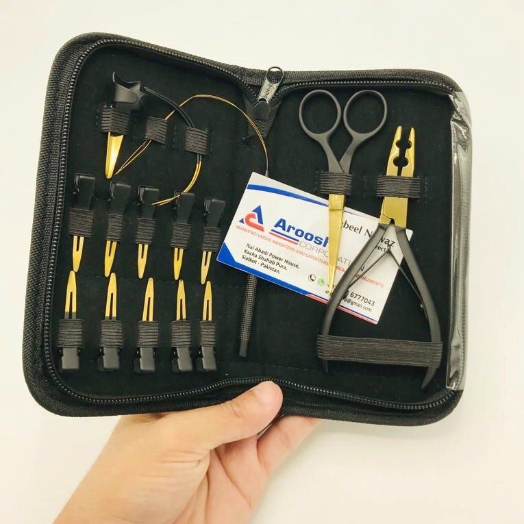 ชุดต่อผมแบบมืออาชีพสีดำทองสแตนเลสเครื่องมือเชื่อมต่อแบบไมโครรวมถึงเข็มซิลิโคนคีมต่อผม