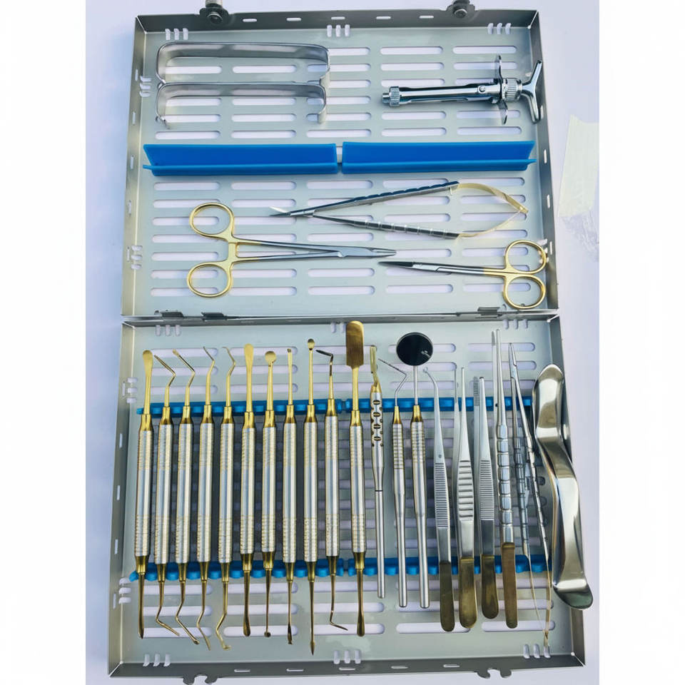 ชุดเครื่องมือผ่าตัดช่องปากขนาดเล็กสำหรับการผ่าตัดปริทันต์ ชุดเครื่องมือผ่าตัดสำหรับการปลูกถ่ายรากฟันเทียม ชุดอุปกรณ์สีทอง