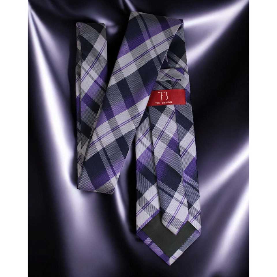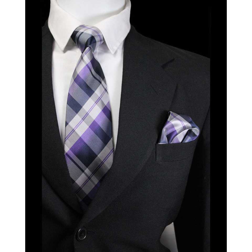 เนคไทลายสก๊อตสีม่วง & น้ำเงินไมโครซิลค์พร้อมกล่องของขวัญผ้าเช็ดหน้าเนคไทพรีเมียม