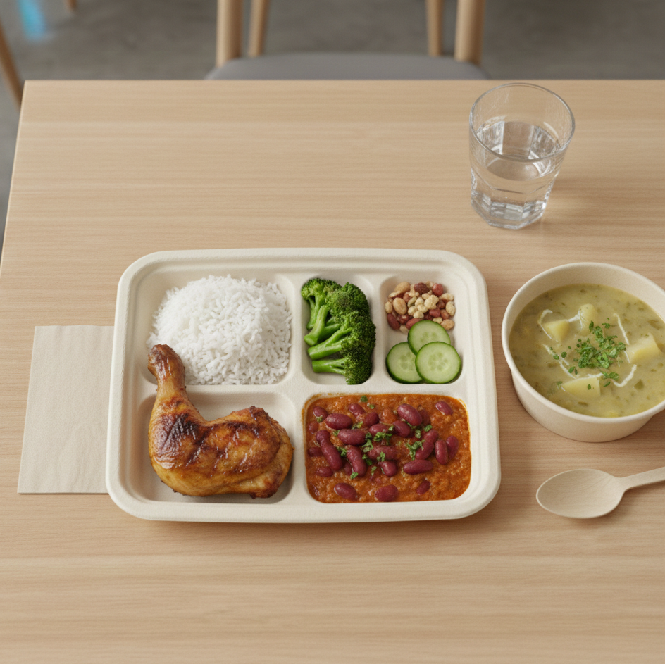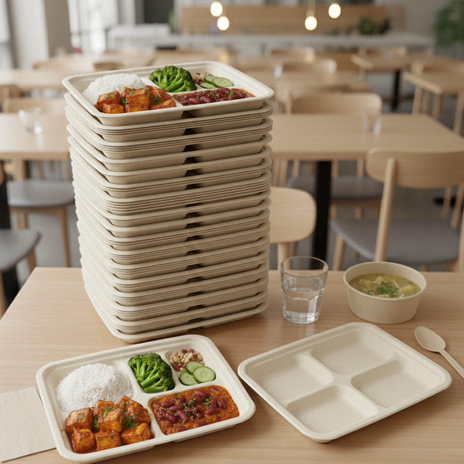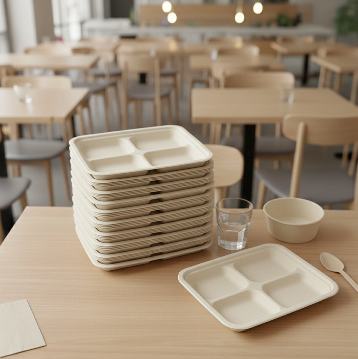 จานแบกาสเซ่แบบ 4-5 ช่อง ใช้กับไมโครเวฟได้ ผลิตจากผลิตภัณฑ์เสริมจากอ้อย สำหรับร้านอาหารฟาสต์ฟู้ดและร้านอาหารแบบบริการรวดเร็ว