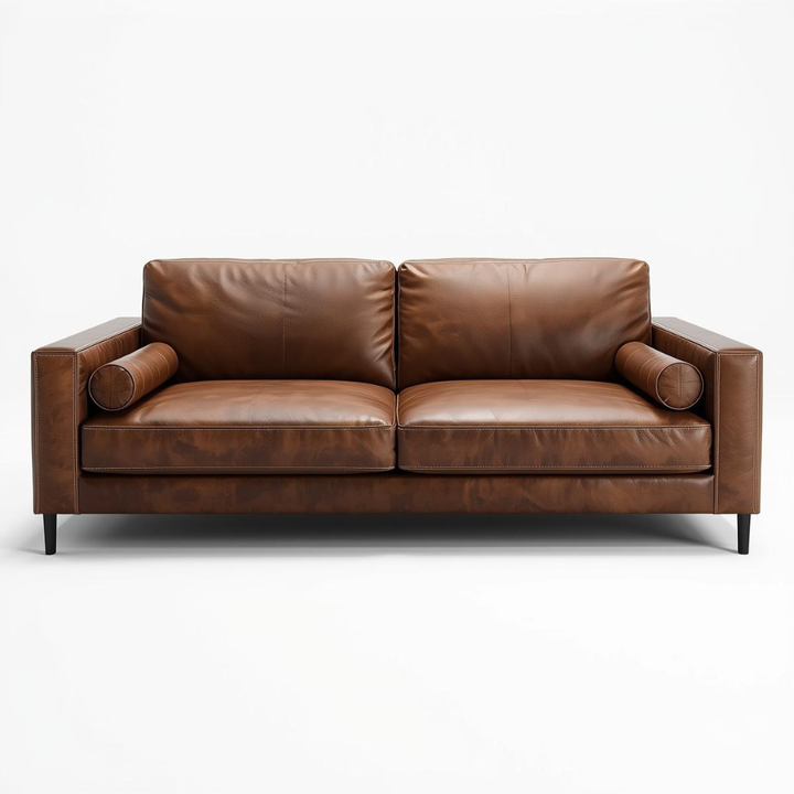 โซฟาหนังสไตล์กลางศตวรรษที่ได้รับแรงบันดาลใจจากยุคกลางศตวรรษ พร้อมความสะดวกสบายแบบร่วมสมัย หุ้มด้วยหนังวัวแท้สำหรับเฟอร์นิเจอร์ในพื้นที่ใช้สอยสมัยใหม่