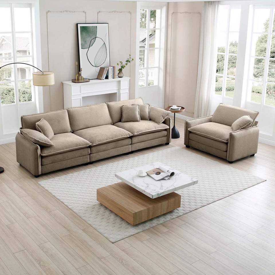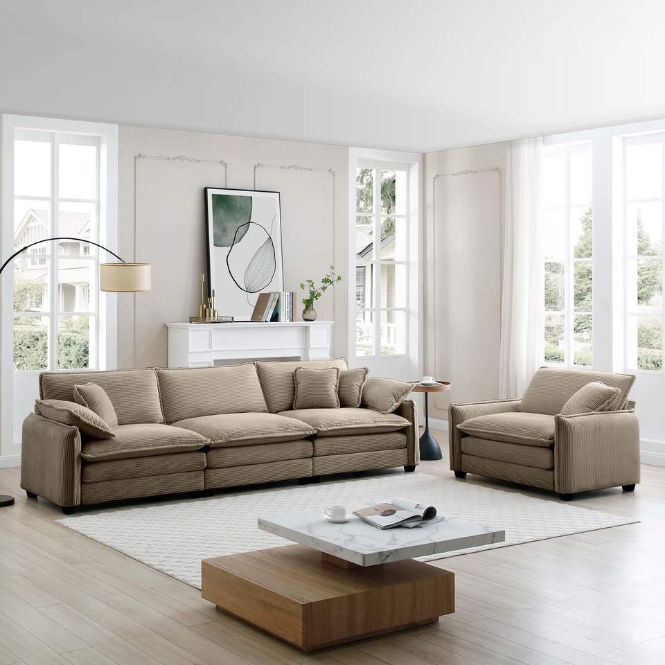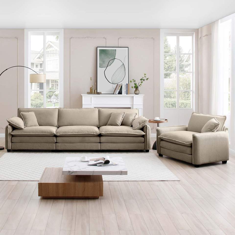 ชุดห้องนั่งเล่นสไตล์มิดเซ็นจูรี่โมเดิร์น ประกอบด้วยโซฟา 3 ที่นั่ง 1 ตัว และโซฟาเดี่ยว 1 ตัว พร้อมหมอนอิง 2 ใบ และหมอนตกแต่ง 4 ใบ จำนวน 2 ชิ้น