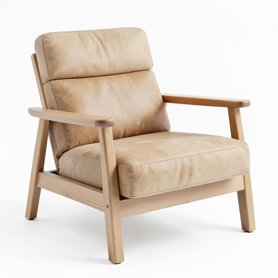 เก้าอี้พักผ่อนสไตล์มิดเซ็นจูรี่โมเดิร์น เบาะหนังวัวแท้ โครงไม้ เฟอร์นิเจอร์ห้องนั่งเล่นระดับพรีเมียม เหมาะสำหรับร้านกาแฟ ร้านอาหาร