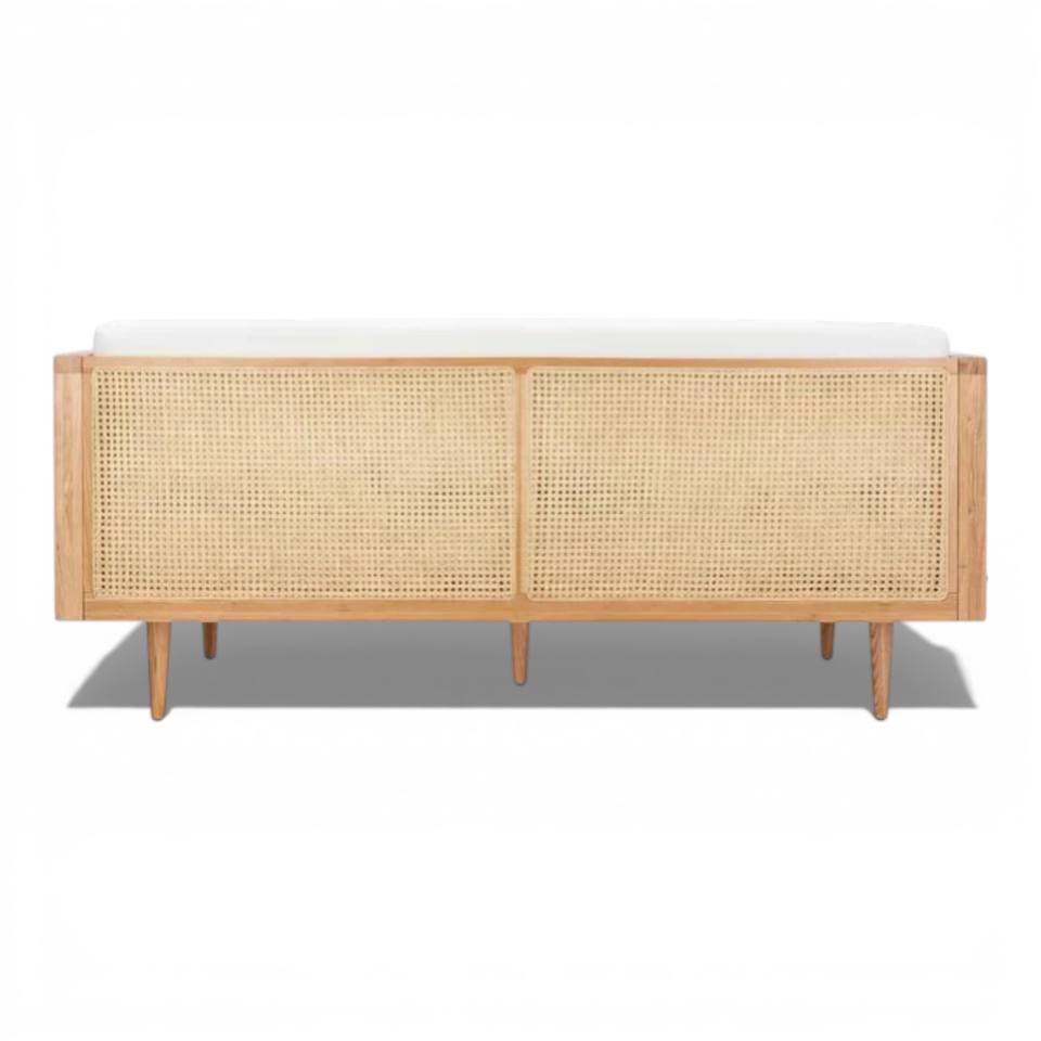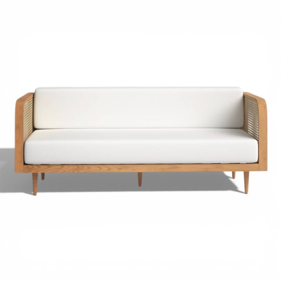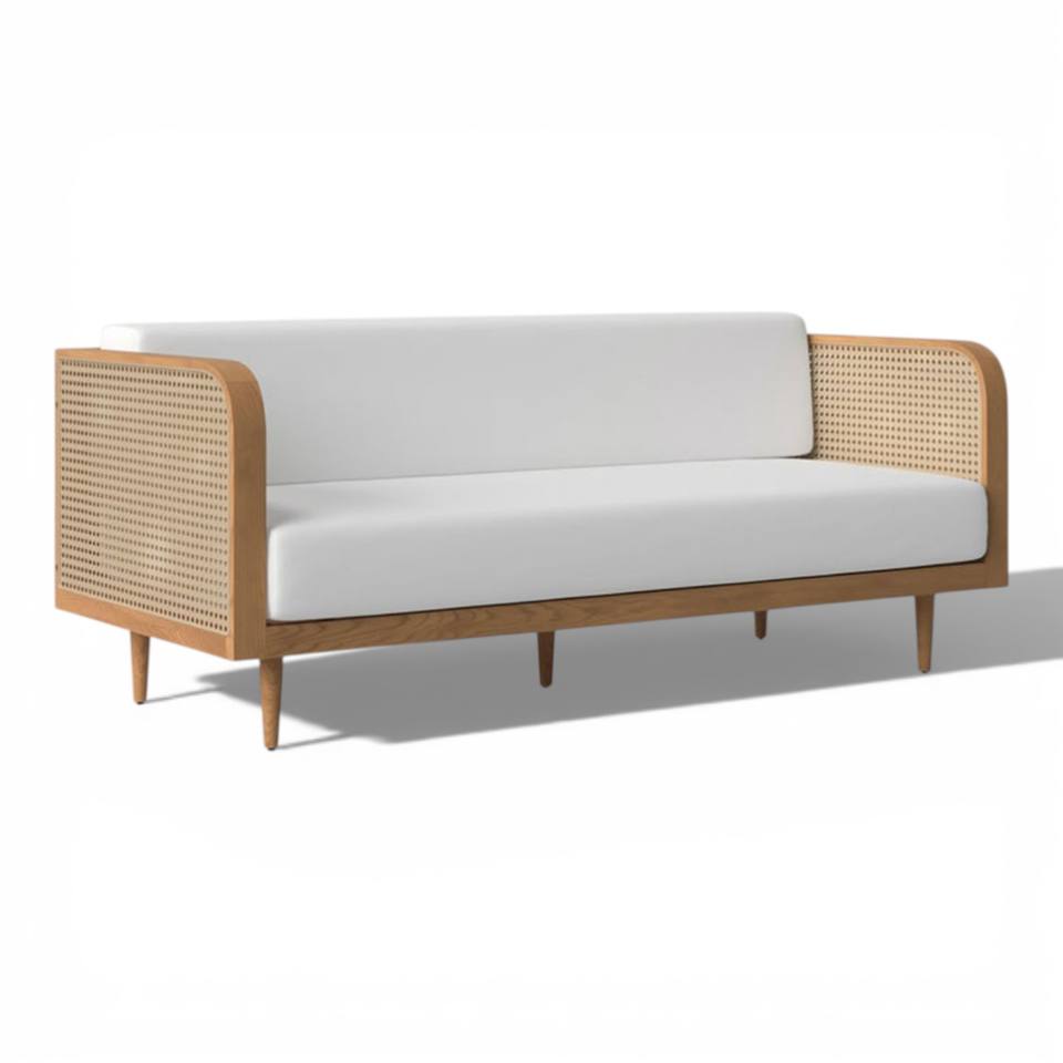 โซฟาไม้สักธรรมชาติสไตล์โมเดิร์นกลางศตวรรษ พร้อมที่วางแขนหวายถักแบบแคนเนจ หุ้มผ้าสีขาวสไตล์มินิมอล 3 ที่นั่ง