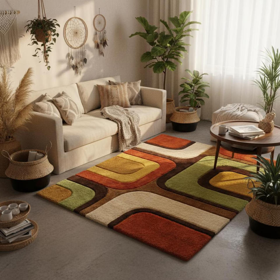 พรมห้องนั่งเล่นลายเรขาคณิตสไตล์เรโทรยุคกลางศตวรรษ | ของตกแต่งบ้านสไตล์ร่วมสมัย ของตกแต่งห้องคุณภาพสูง ของขวัญสำหรับงานแต่งงาน