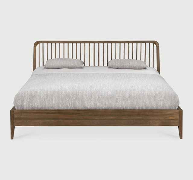เตียงคิงไซส์โครงไม้สักแท้สไตล์โมเดิร์น Auberge du Soleil พร้อมหัวเตียงโค้งมนแบบ Spindle และฐานเตียงแบบ Platform ดีไซน์มินิมอลหุ้มเบาะ