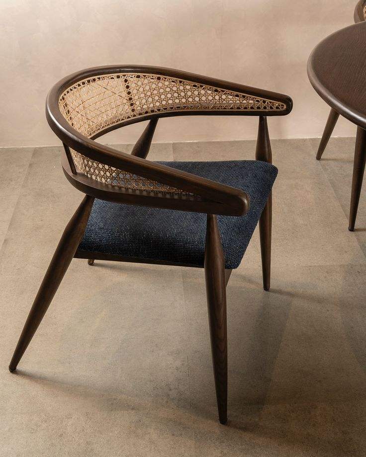 เก้าอี้เท้าแขนทำจากไม้สไตล์โมเดิร์นกลางศตวรรษพร้อมพนักพิงหวายโค้งและเบาะหนังรองนั่งสำหรับห้องรับประทานอาหารหรือพื้นที่เลานจ์