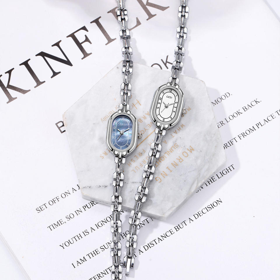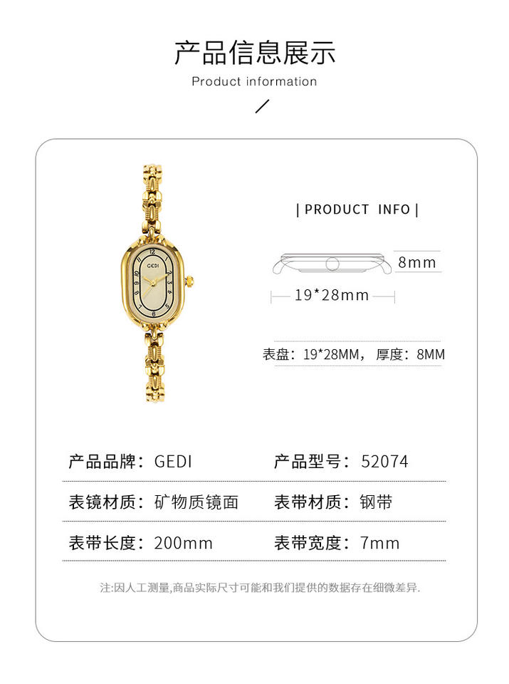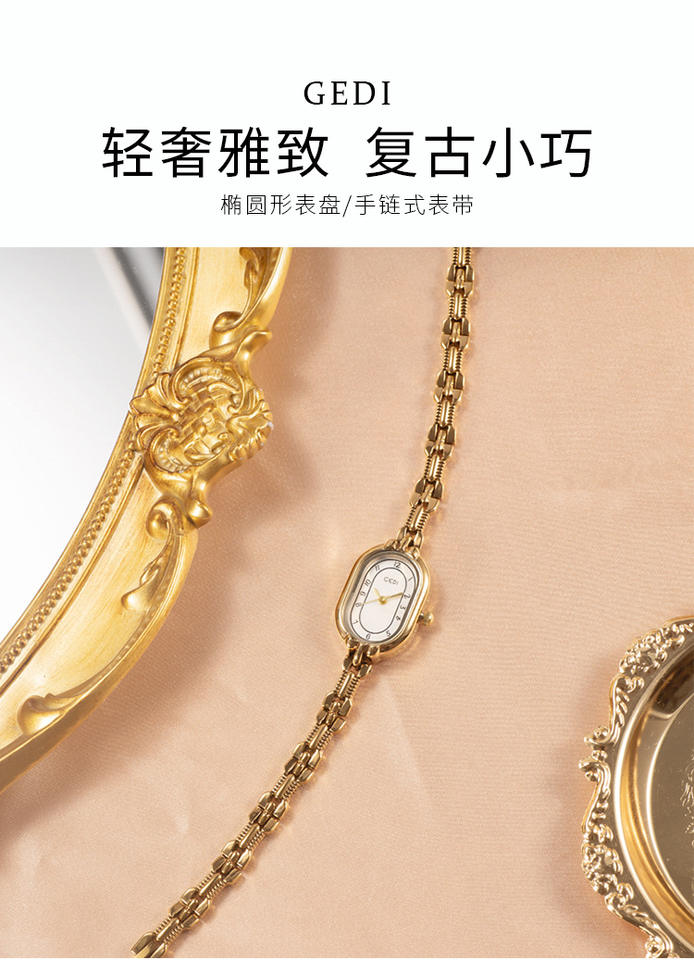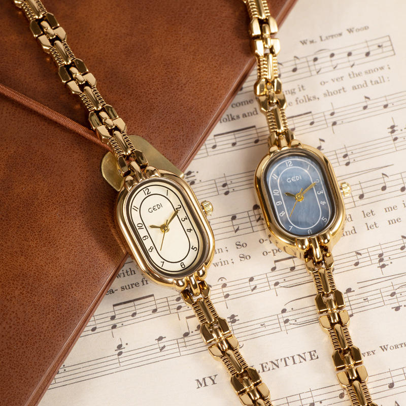 นาฬิกาควอตซ์สไตล์มิดเซ็นจูรี่ ดีไซน์วินเทจแบบวรรณกรรม นาฬิกาสีทองขนาดเล็ก ให้ความรู้สึกหรูหราด้วยดีไซน์แบบสายสร้อยข้อมือ